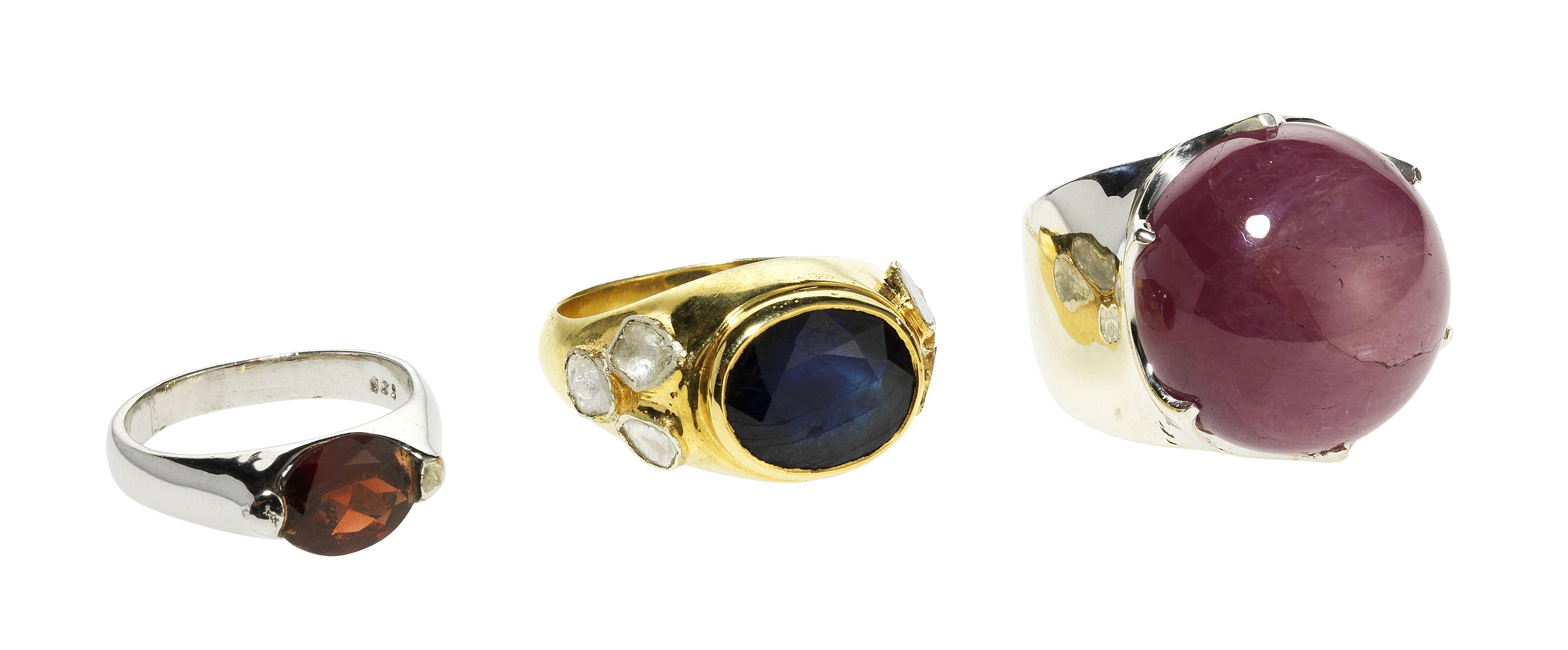 L'une sertie d'un rubis taille cabochon (42,05 ct), la deuxième sertie d'un saphir taille ovale épaulé de diamants en table, la troisième sertie d'un grenat taille ovale, argent et vermeil 925, doigt 55-15, 56-16 et 52-12, la première bague est accompagnée d'un certificat WGI. Pour les lots précédés d'un *, la TVA de 7,7% est due sur l'entier du prix d'adjudication.