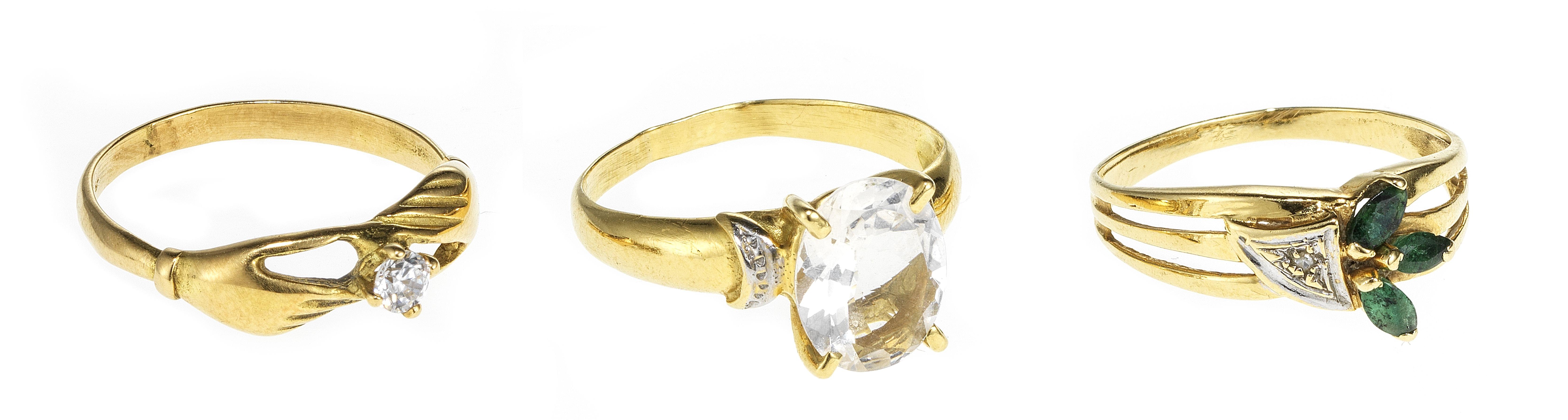 L'une à motif de deux mains retenant un petit diamant, la deuxième sertie d'une aigue-marine taille ovale (env. 1,6 ct) et la troisième sertie d'émeraudes taille marquise, or 750, doigt 52-12 et 54-14, 6 g. Pour les lots précédés d'un *, la TVA de 7,7% est due sur l'entier du prix d'adjudication.