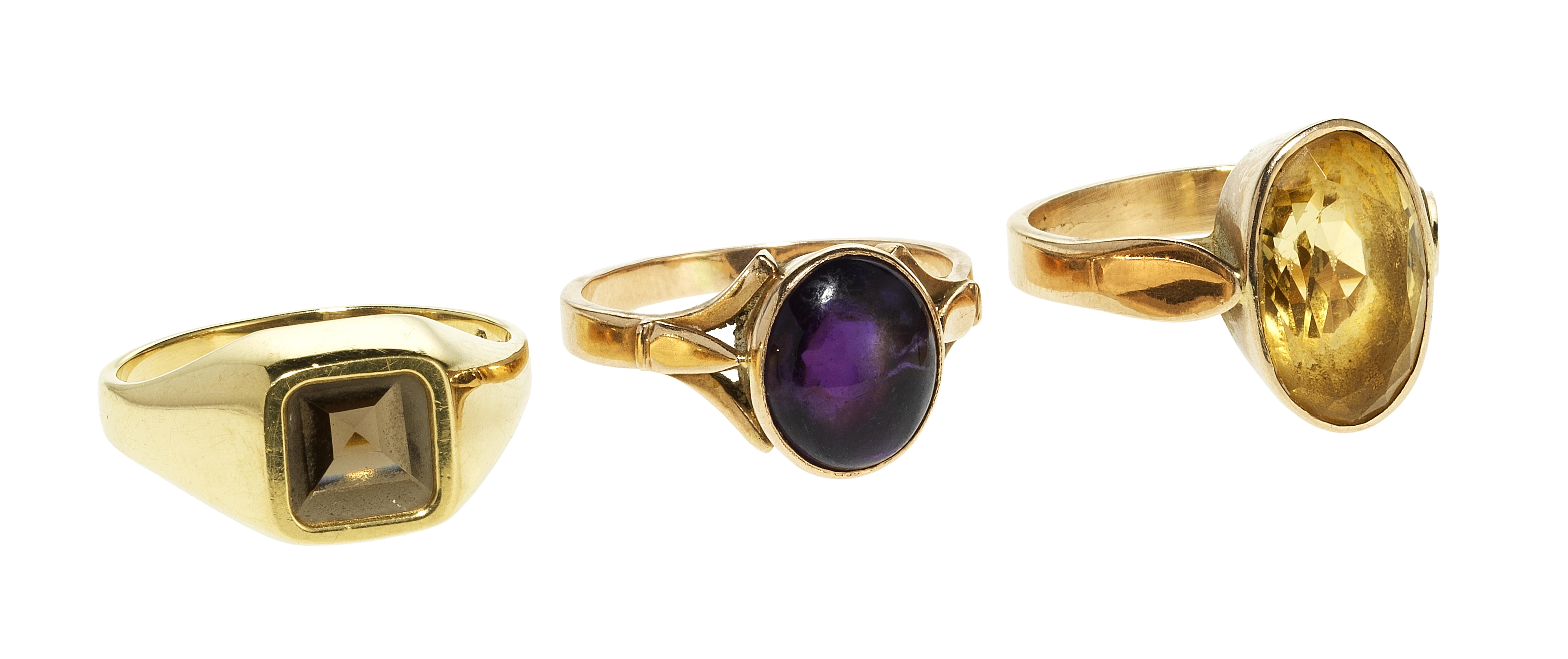 Serties l'une d'une améthyste taille cabochon, la deuxième d'une citrine taille ovale et la troisième d'un quartz fumé, or 750 et 585, doigt 57-17, 15 g