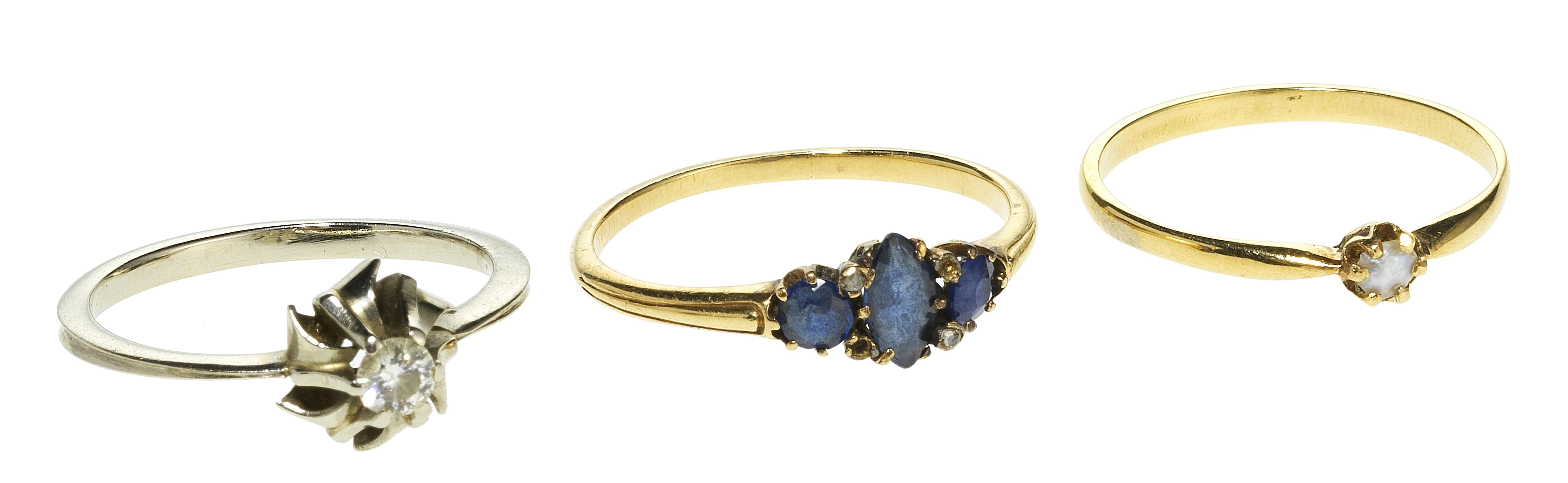 L'une sertie de trois saphirs rehaussés de roses de diamants, l'une sertie d'un diamant (env. 0,15 ct) et la troisième sertie d'une demi-perle, or 750 et 585, doigt 56-16, 53-13 et 54-14, 5 g
