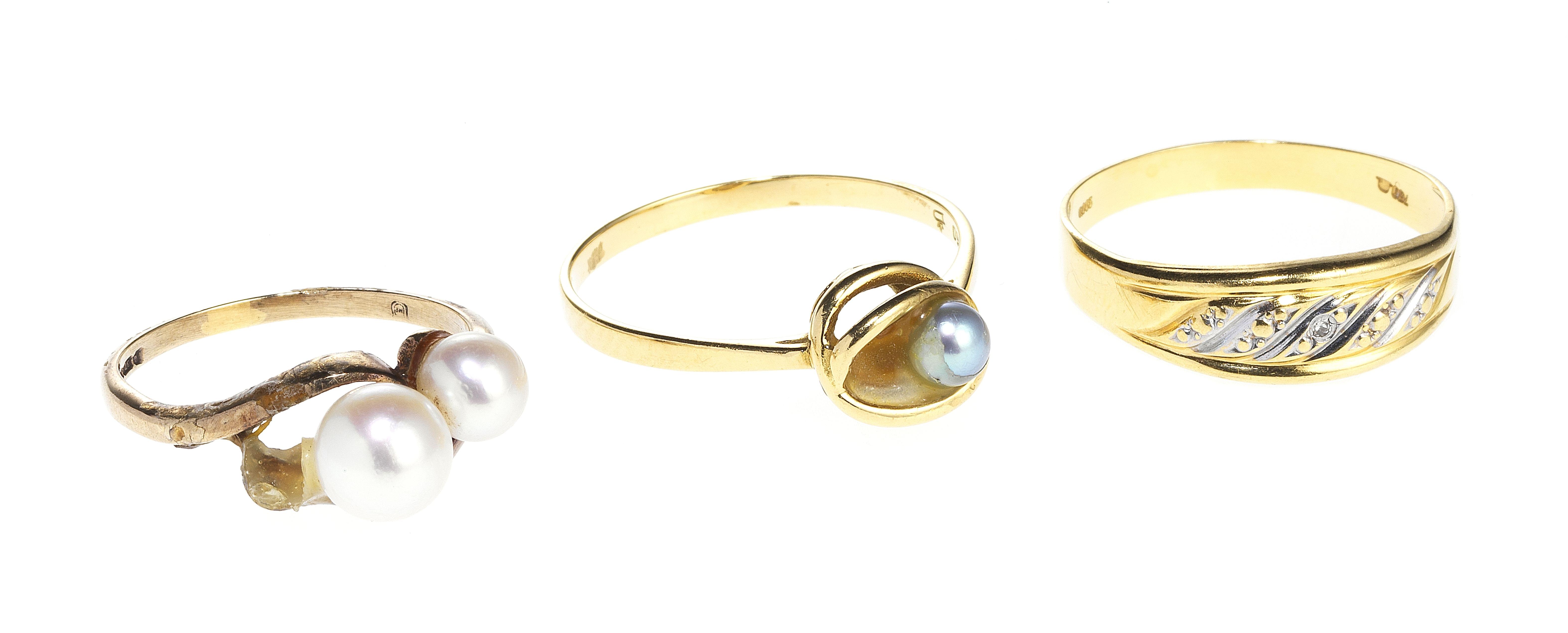 Deux d'entre elles serties de perles, la troisième sertie d'un petit diamant, or et or gris 750, or 375, doigt 54-14, 60-20, 62-22, poids brut 7 g