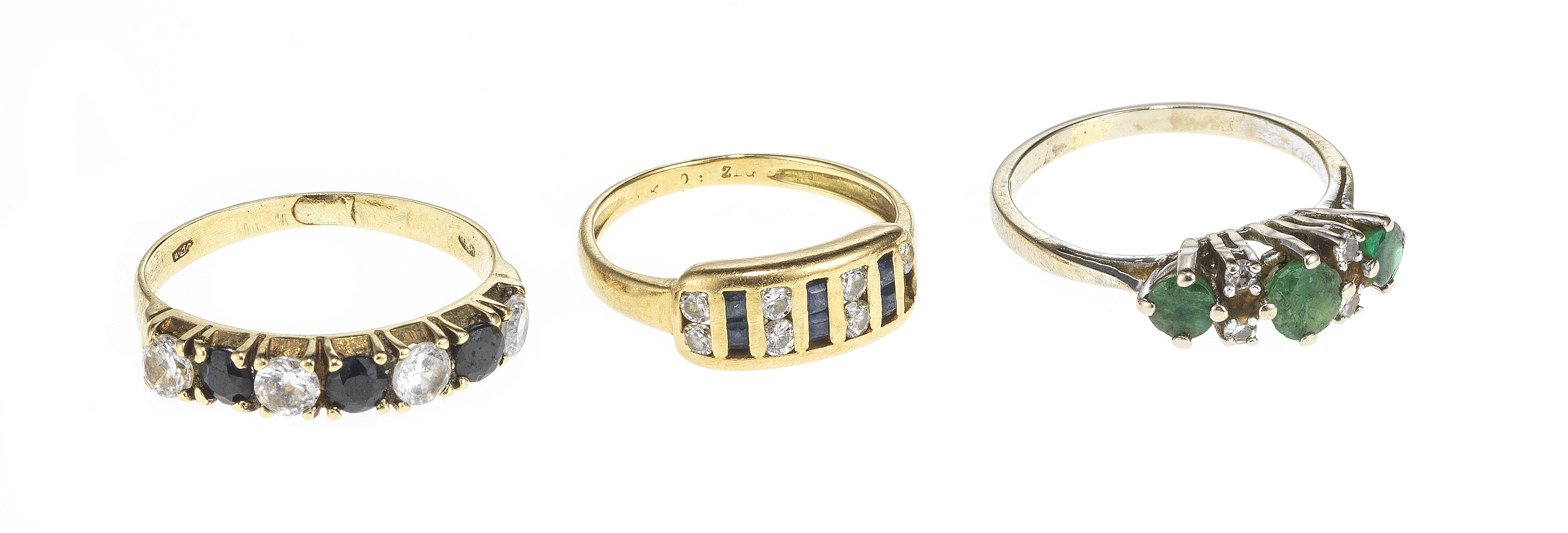 L'une sertie de trois émeraudes alternées de diamants, la deuxième sertie d'une ligne de saphirs alternés de pierres d'imitation pour le diamant, la troisième sertie de saphirs et diamants, or 750, doigt 49-9, 51-11 et 53-13, 7 g