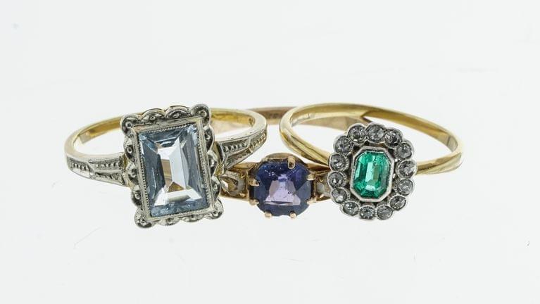 3072. Lot de trois bagues, l'une sertie d'un verre bleu imitant le saphir épaulé de deux roses de diamant, l'une sertie d'un spinelle synthétique bleu taille rectangle et l'une sertie d'une émeraude taille rectangle entourée de diamants