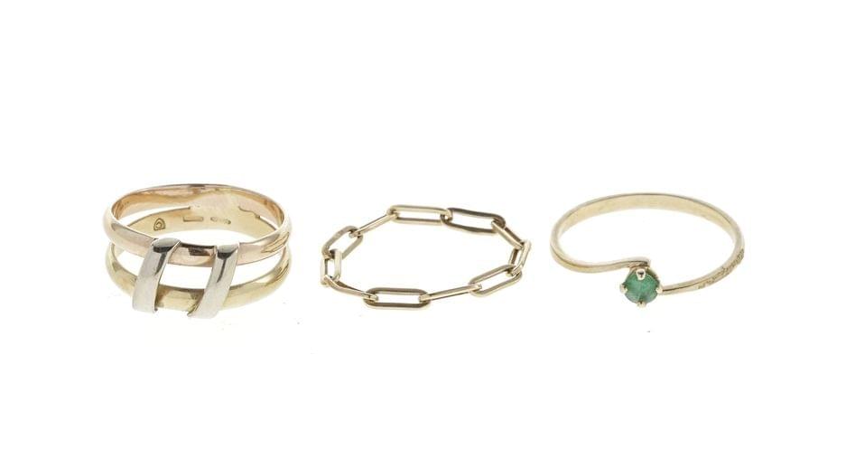 3053. Lot de trois bagues, l'une sertie d'une émeraude, l'une trois ors et l'une en maille figaro souple