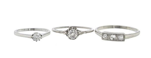 3174. Lot de trois bagues serties de diamants dont deux solitaires taille ancienne (env. 0.15 et 0.25 ct) et une trilogie taille ancienne (env. 0.18 ct)