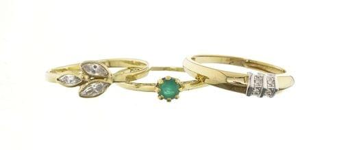 3150. Lot de trois bagues, une sertie de quatre brillants, une sertie d'une émeraude et une sertie de trois diamants d'imitation taille navette