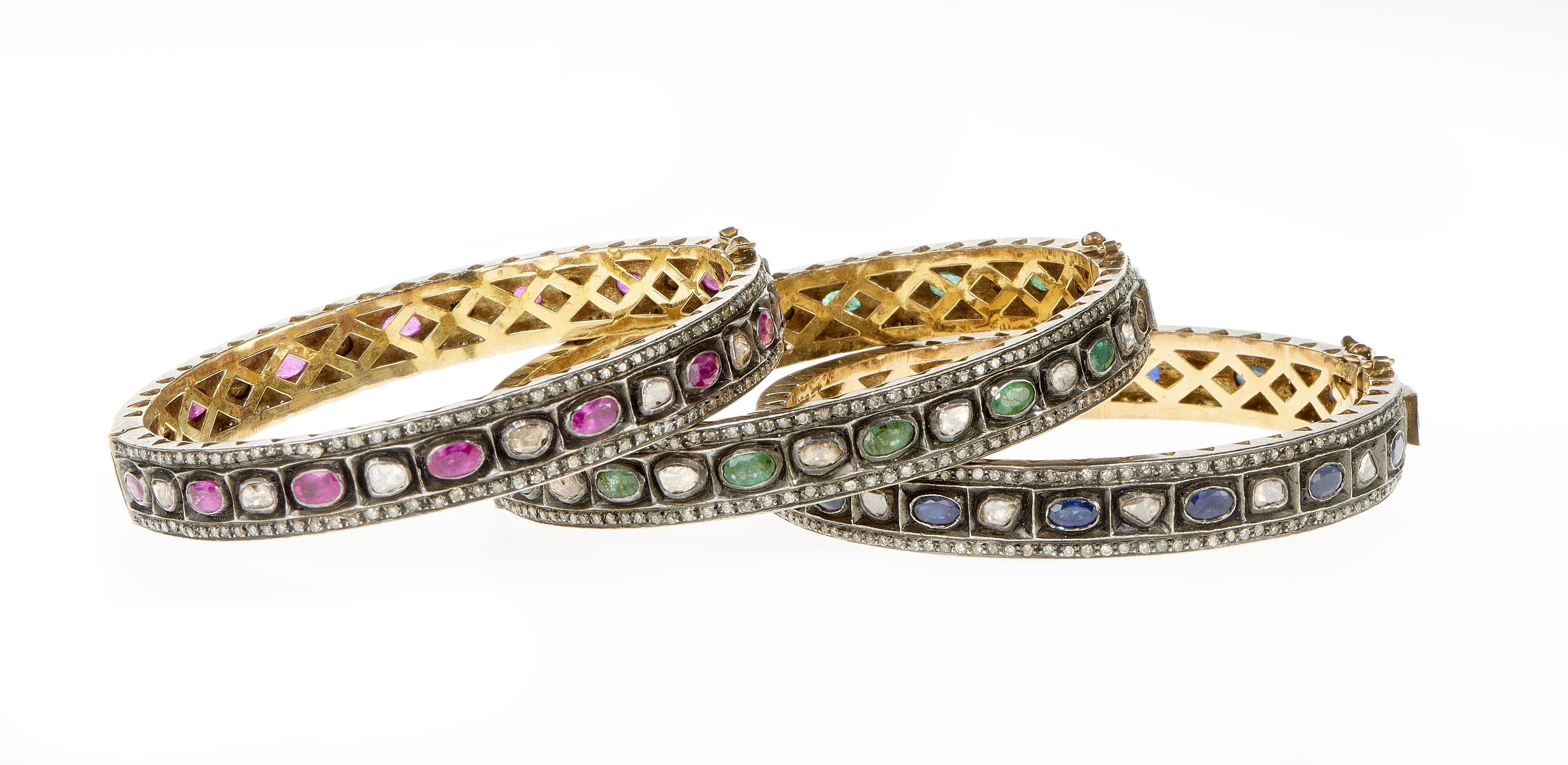 Entièrement sertis pour l'un d'émeraudes, le deuxième de rubis et le troisième de saphirs taille ovale alternés de diamants taille rose et encadrés par deux lignes de diamants taille 8/8, travail indien, argent et vermeil 925, D 5,5 cm