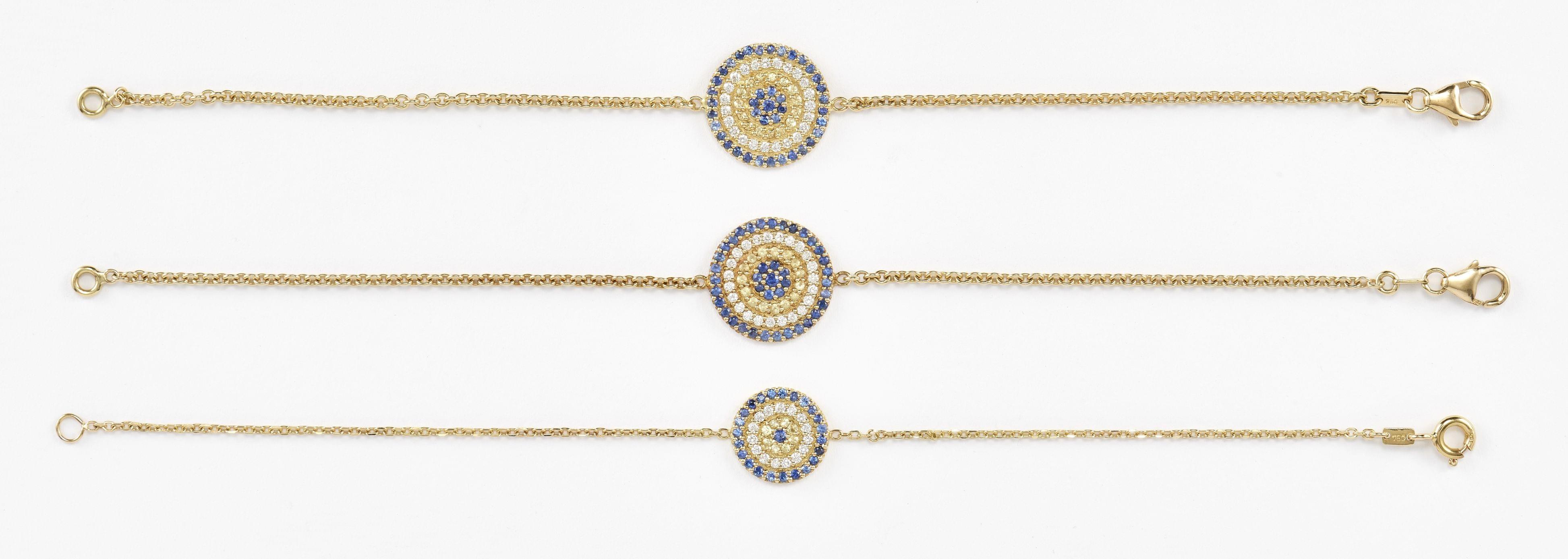 3330. Lot de trois bracelets retenant chacun un motif rond pavé de diamants et de saphirs
