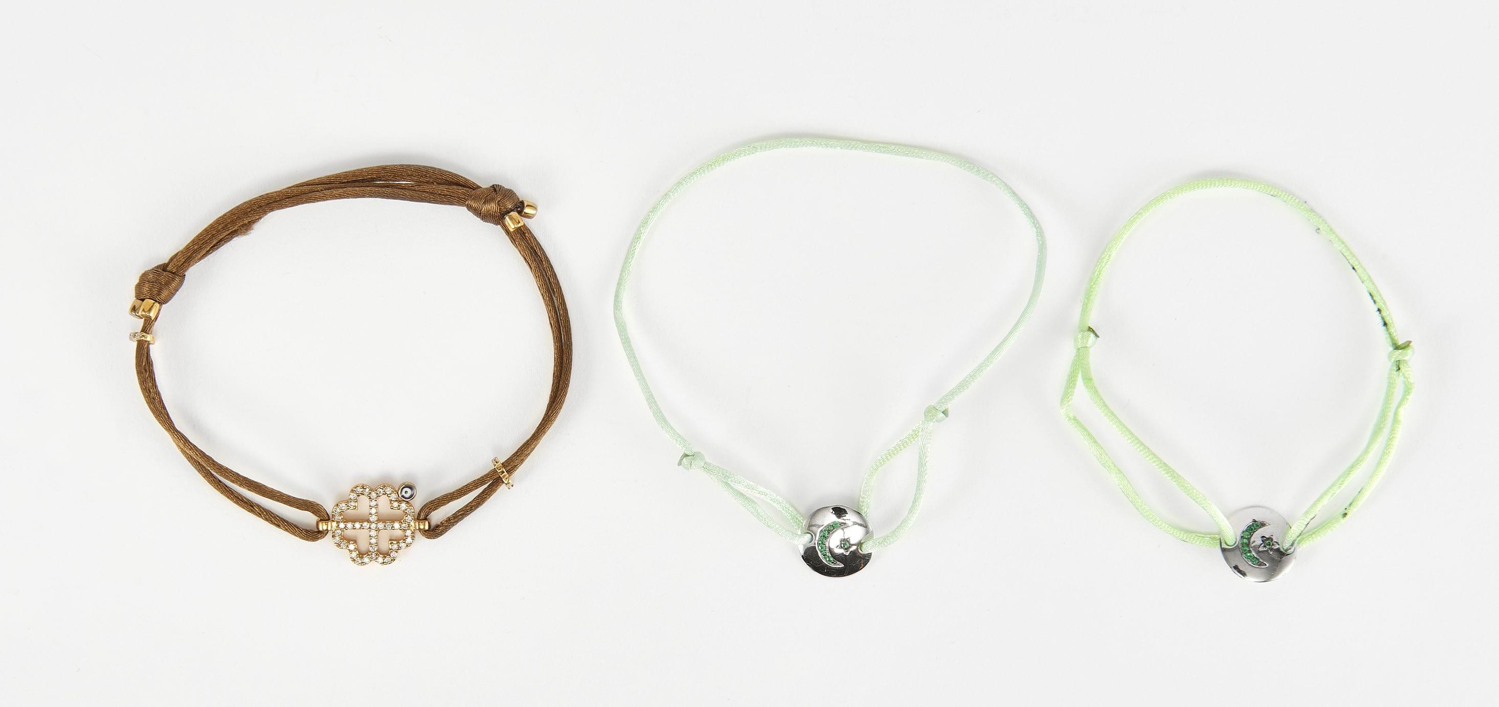 3245. Lot de trois bracelets sur cordon, l'un retenant un motif de fleur ajourée sertie de diamants et les deux autres retenant une médaille aux motifs de la Lune et du Croissant sertis d'émeraudes