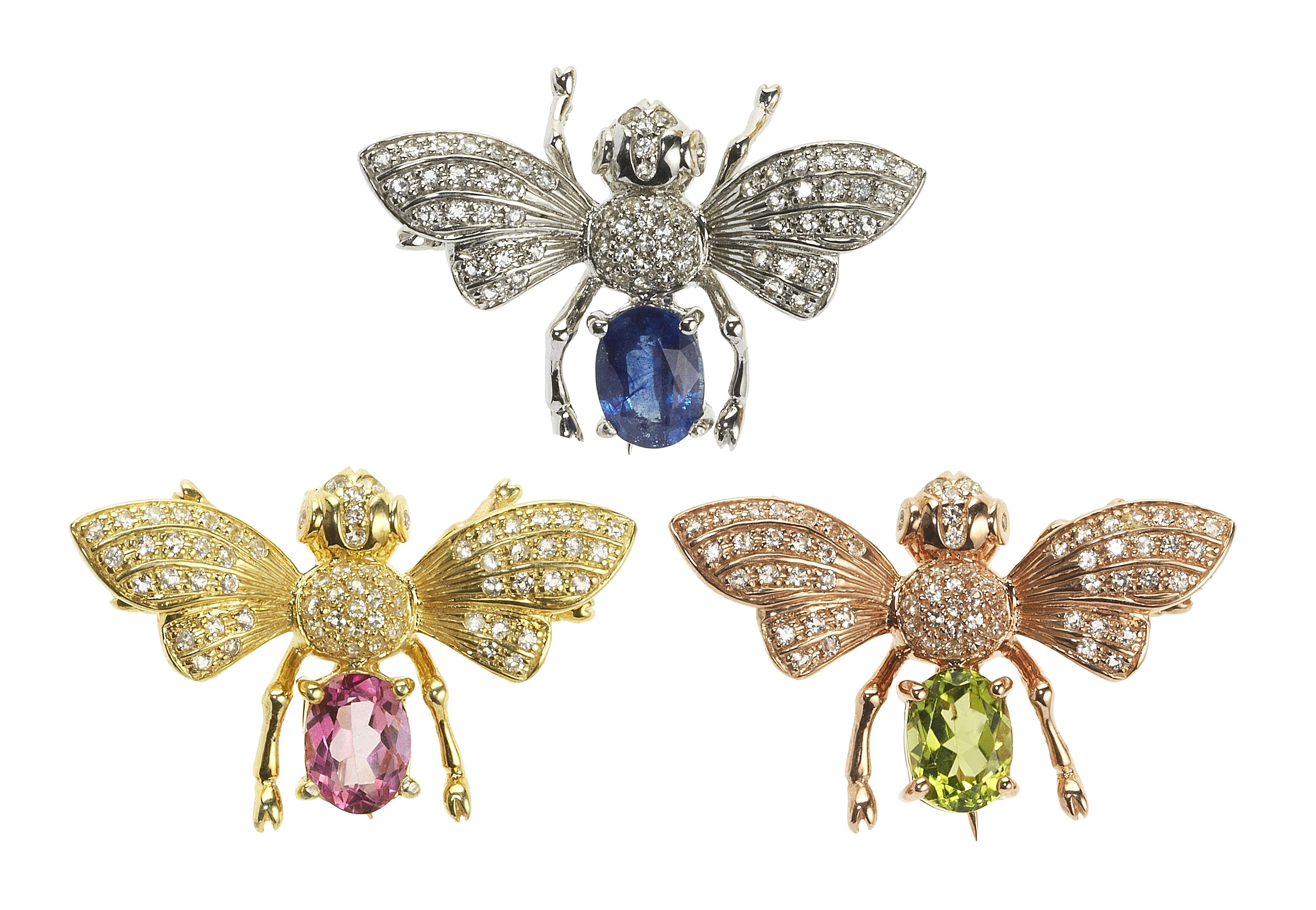 Pavées de topazes blanches et aux corps sertis pour la première, d'un saphir, la deuxième d'une topaze rose et la troisième d'un péridot, argent, vermeil et argent rosé 925, env. 2x3 cm. Pour les lots précédés d'un *, la TVA de 7,7% est due sur l'entier du prix d'adjudication.