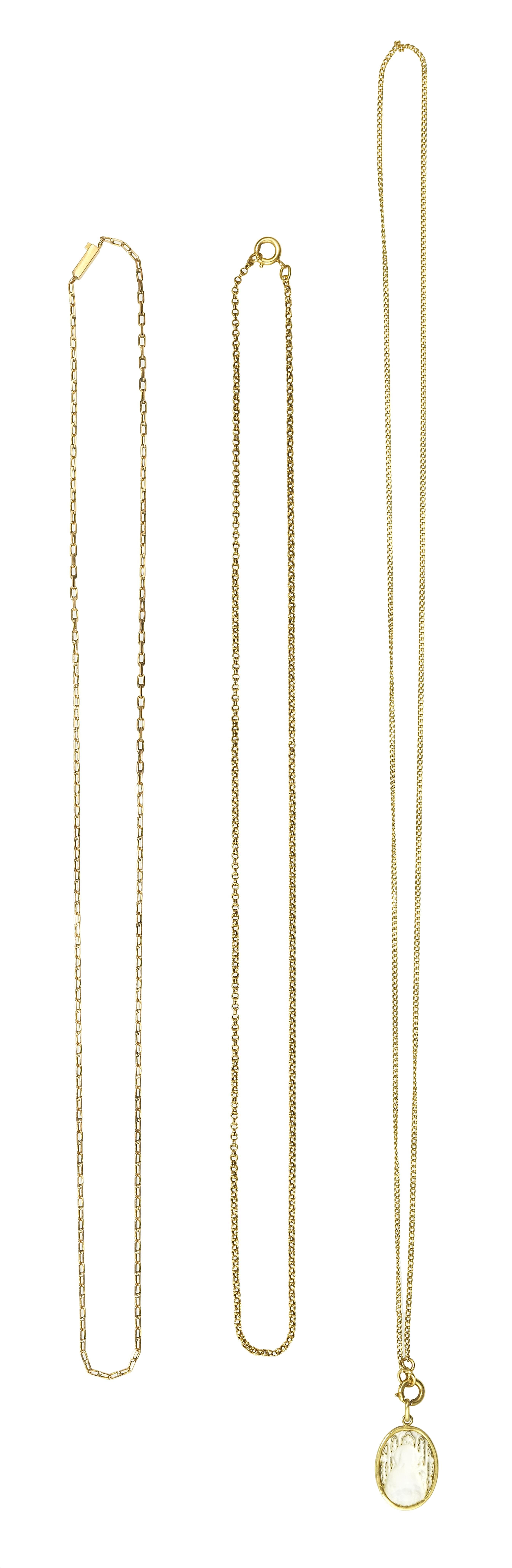 L'une à maille gourmette retenant une médaille en nacre, l'une à maille ovale et la troisième à maille ronde stylisée ancienne, or 750 et 585, L 63, 54 et 52 cm