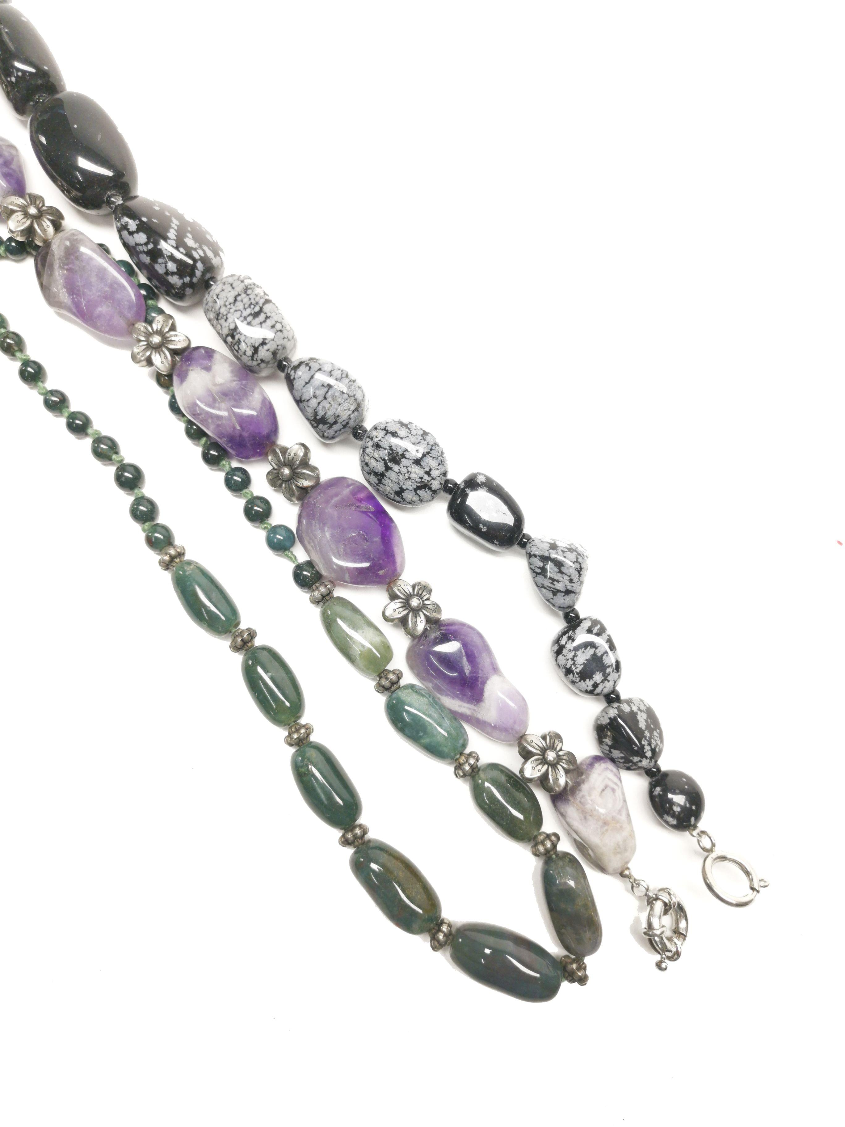 L'un composé de perles d'améthyste polies alternées de motifs de fleurs en argent, l'un composé de perles d'obsidiennes polies en chute et le dernier composé de perles de jaspe sanguin polies, fermoirs en argent et en métal, L 45, 50 et 60 cm