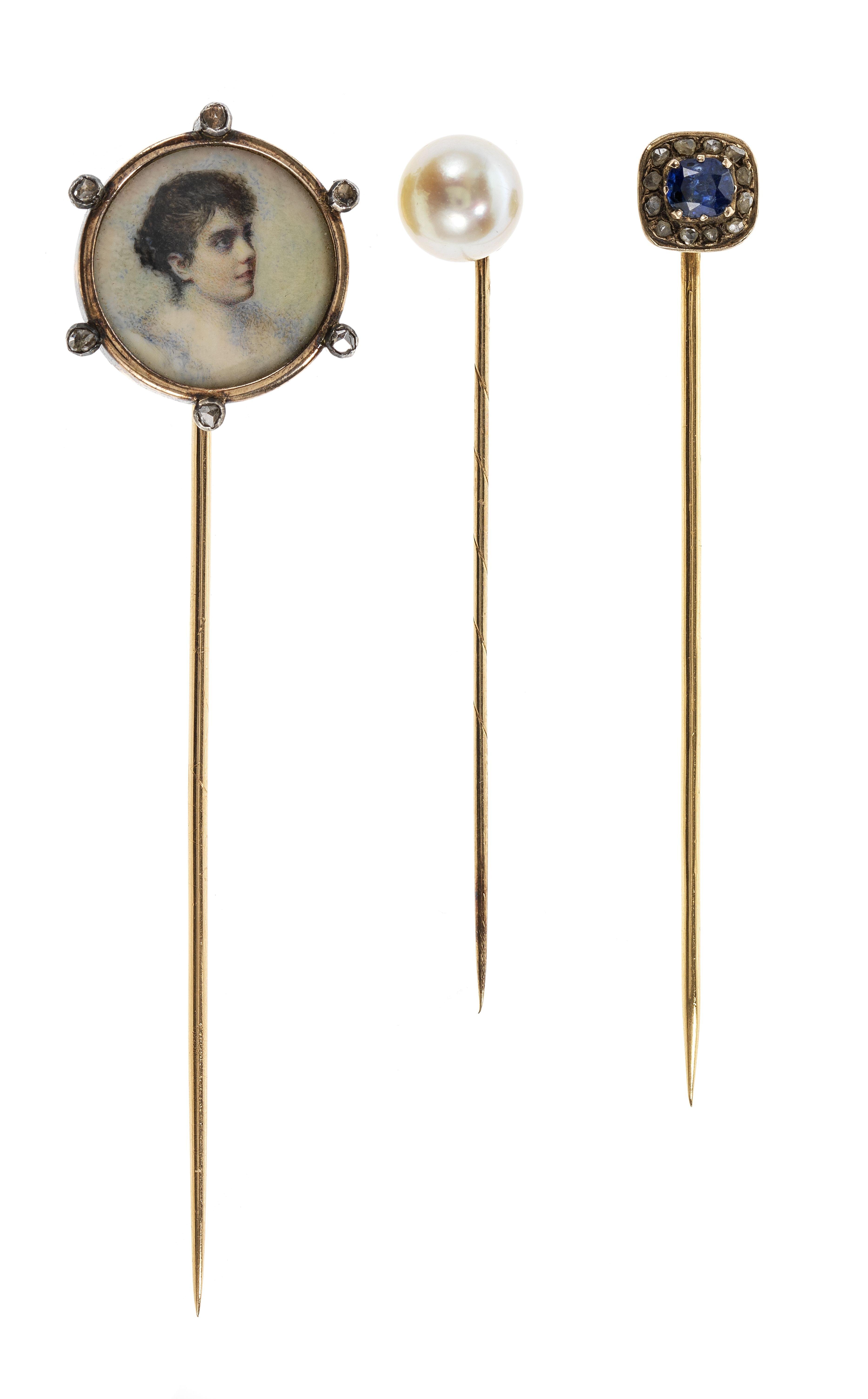 L'une sertie d'une perle probablement fine, la deuxième sertie d'un saphir entouré de roses de diamant et la troisième sertie d'une miniature, or 750 et or 585, entre 5,5 et 8 cm, poids brut 7 g