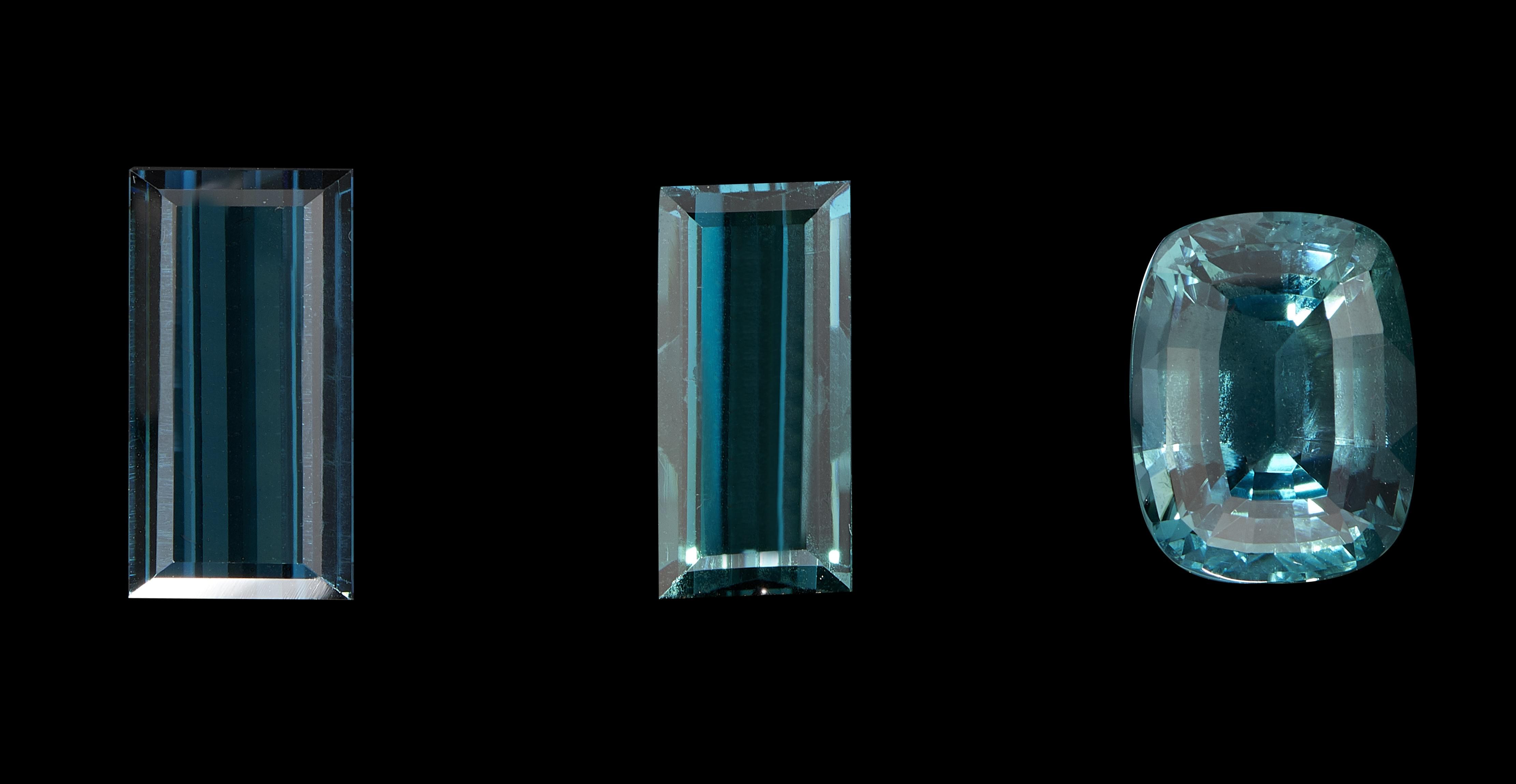 Lot de trois indigolites sur papier, l'une taille ovale (4,9 ct) et les deux autres taille rectangle à degrés (2,7 ct et 3,6 ct)