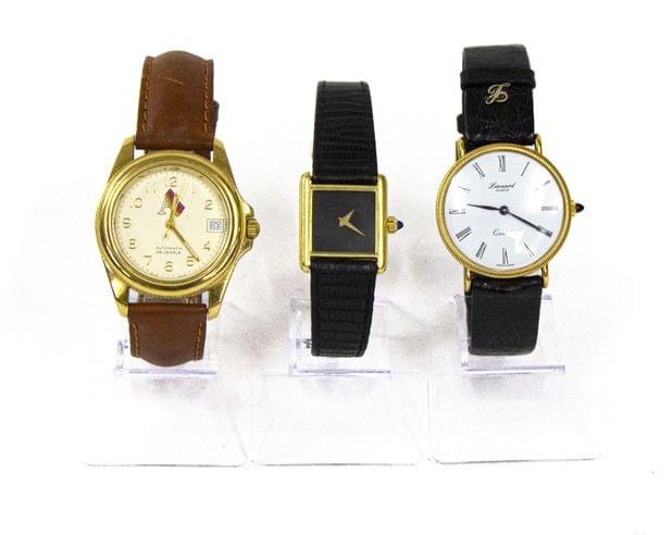 L'une ronde et automatique, cadran crème et aiguilles dorées, métal doré, D 33 mm, la deuxième signée Léonard, ronde à quartz, cadran blanc et aiguilles bleues, métal doré, D 30 mm, et la dernière rectangulaire mécanique à cadran noir et aiguilles dorées, boîtier en or 750, 17x20 mm