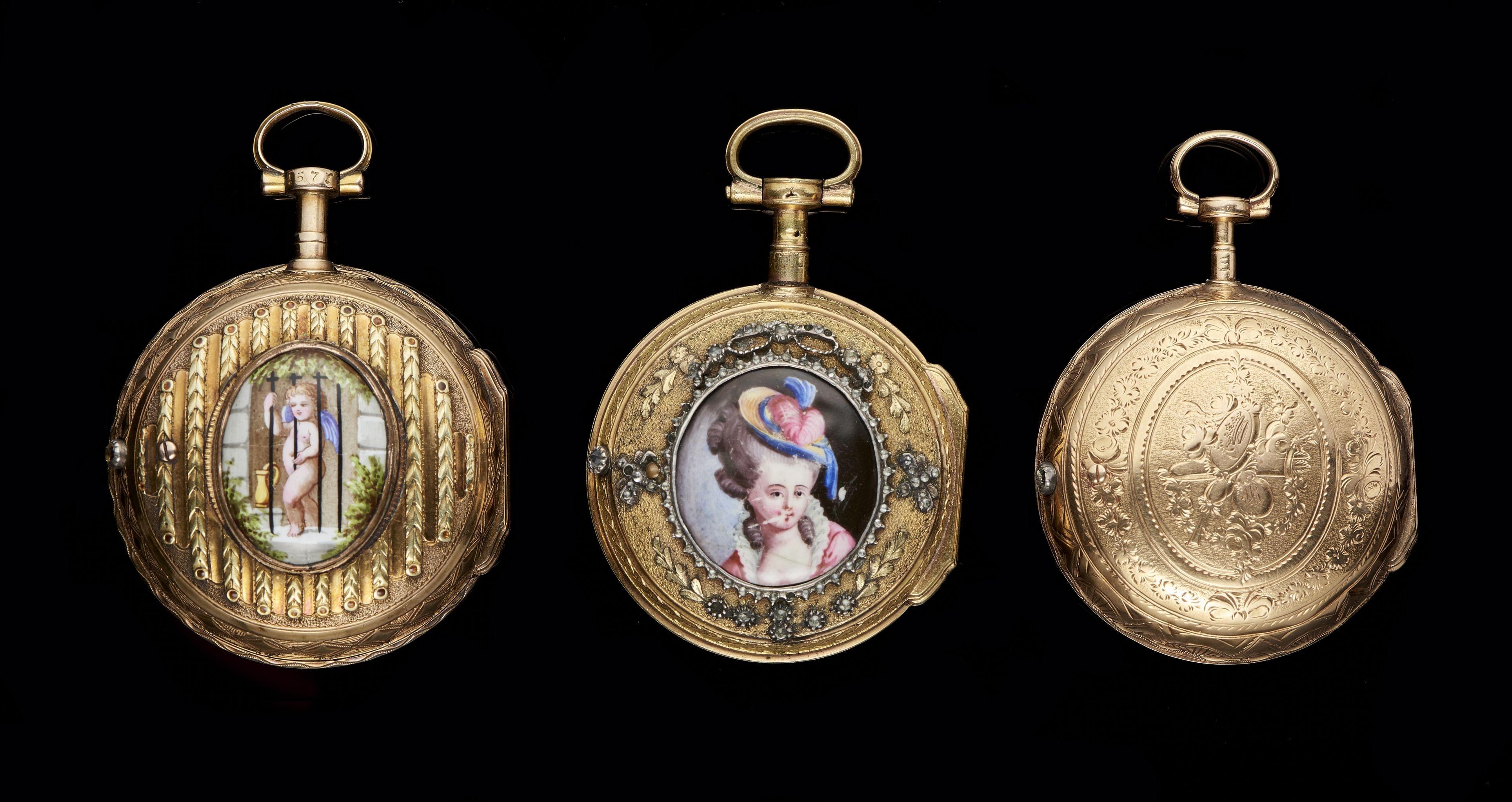 71. Lot de trois montres de poche, l'une signée Marc Duboué et à décor peint d'un angelot et à guirlandes deux tons d'ors, la deuxième signée Le Roy à Paris et à portrait peint de femme et la troisième signée Baillon à Paris