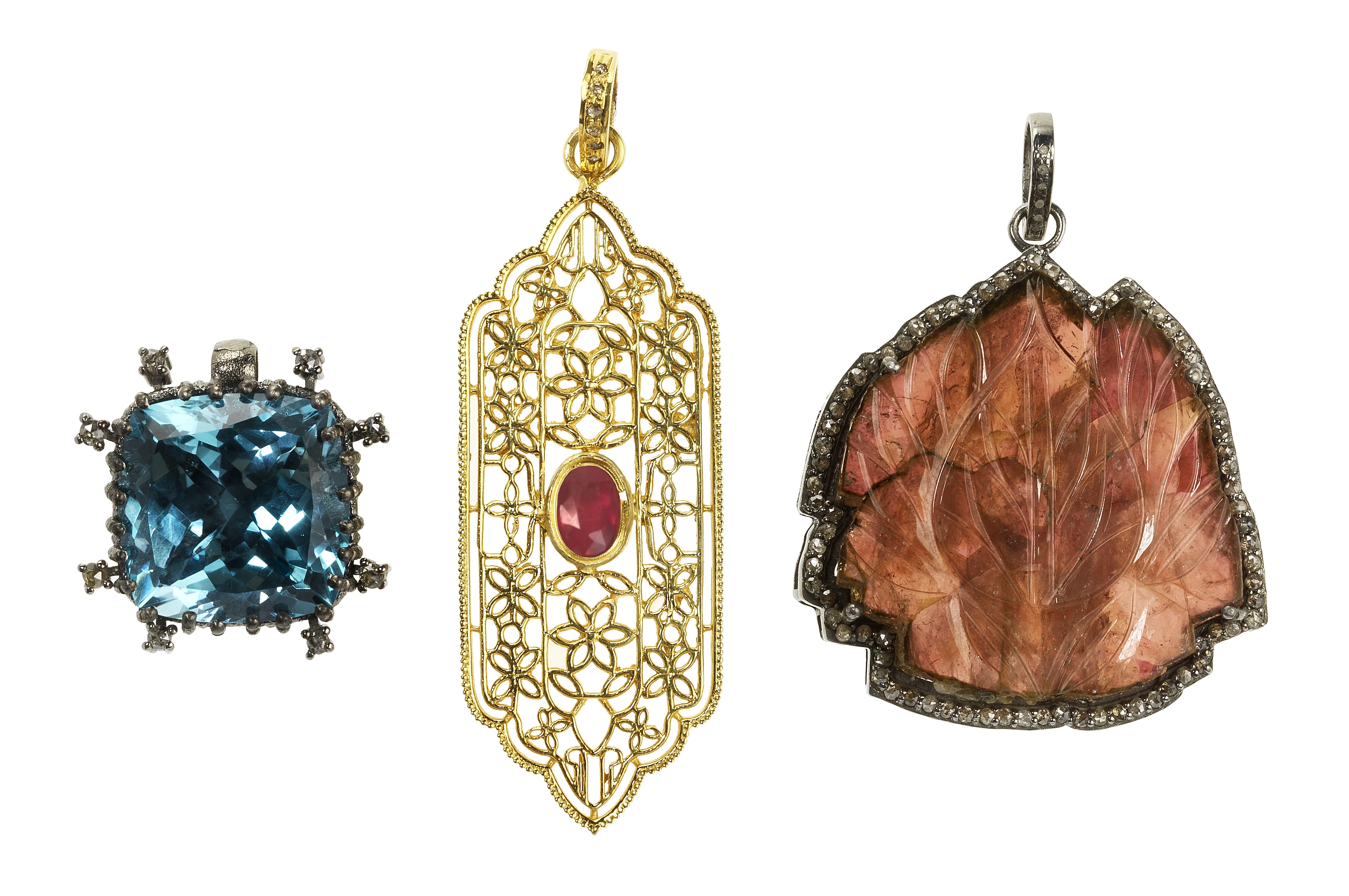 Le premier centré d'une tourmaline rose sculptée à décor de lotus (67 ct) entourée de roses de diamants, le deuxième à décor de fleurs ajourées centré d'un rubis taille ovale et le troisième serti d'une topaze bleue taille coussin (32 ct) entourée de roses de diamant, argent 925, H 5, 6,5 et 2,5 cm, la tourmaline accompagnée d'un certificat GRS. Pour les lots précédés d'un *, la TVA de 7,7% est due sur l'entier du prix d'adjudication.