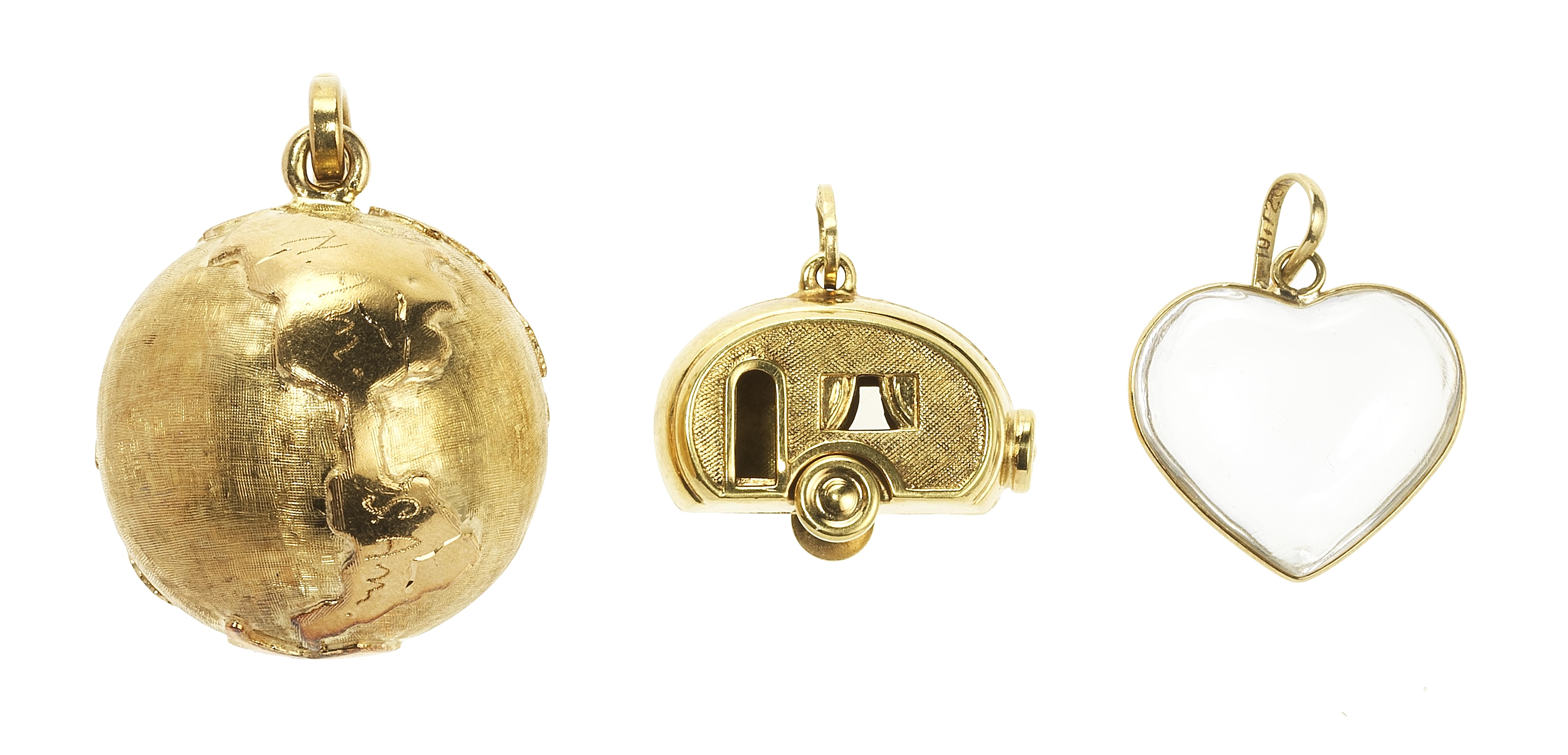 L'un à motif de globe terrestre, l'un à motif de caravane et le troisième à motif de cœur serti d'un cristal de roche, or 750, poids brut 15 g. Provenance: collection Marisa Perret-Rezzonico