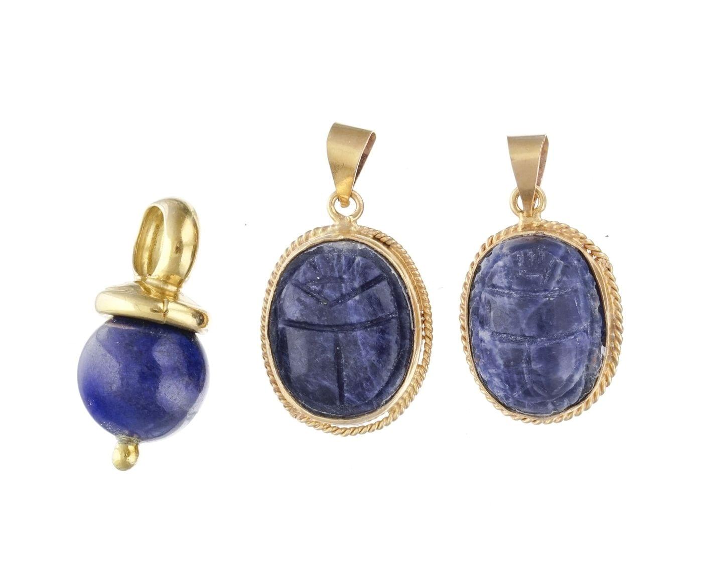 3207. Lot de trois pendentifs, l'un retenant une boule de lapis-lazuli et les deux autres à motif de scarabée en sodalite