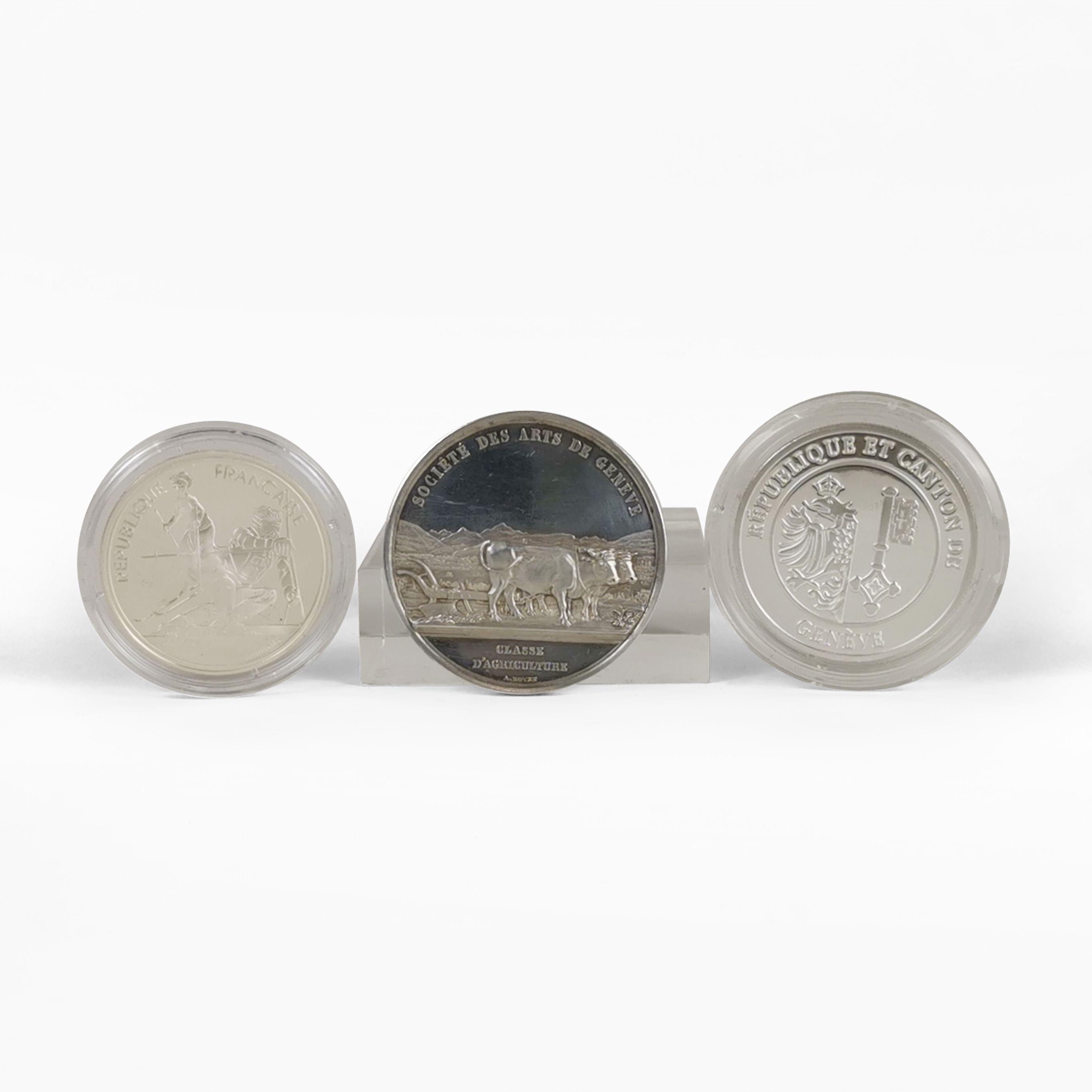Un sablier de la République et Canton de Genève, une pièce commémorative de 100 francs des Jeux Olympiques d'Albertville datée 1990 et une pièce commémorative de la Société des Arts de Genève, argent, 93 g