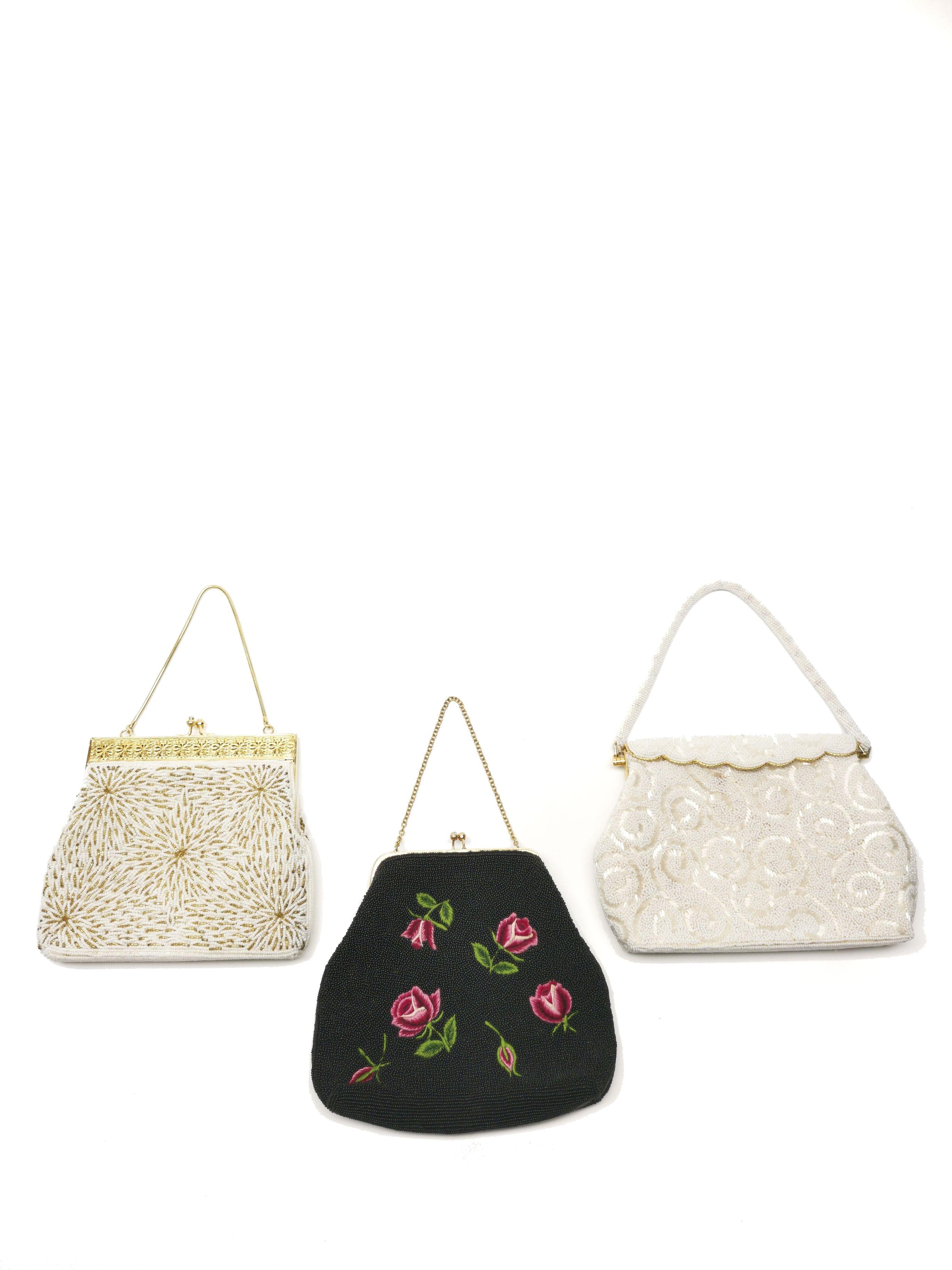 Perlettes blanches, noires et dorées et fleurs brodées,16x19, 16x23 et 17x22 cm