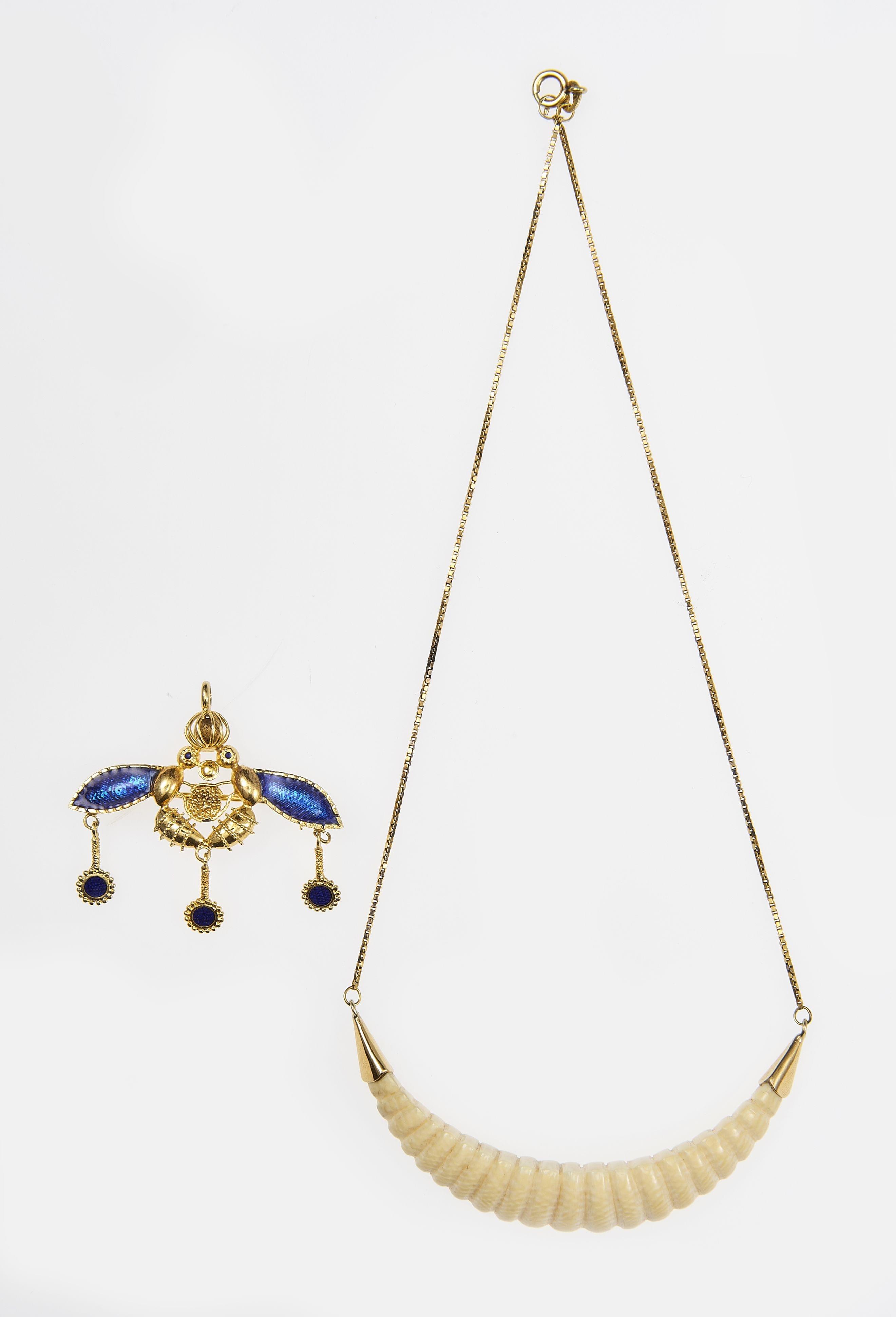 3356. Lot d'un collier retenant un motif en ivoire et d'une broche-pendentif émaillée à motif de deux guêpes affrontées
