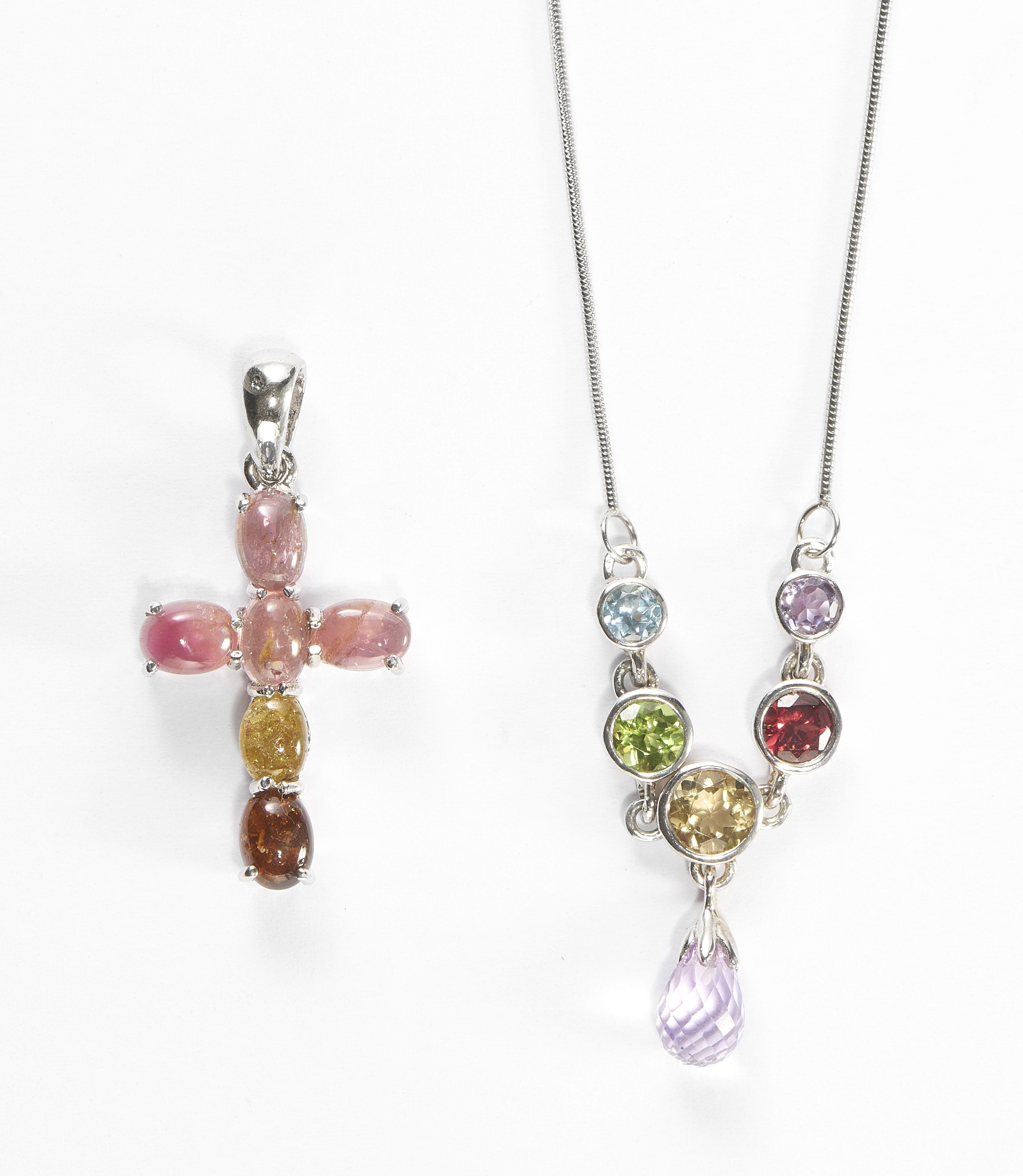 3153. *Lot d'un collier retenant une améthyste taille briolette rehaussée de citrine, grenat, péridot, améthyste et topaze bleue et d'une croix sertie de tourmalines taille cabochon ovale
