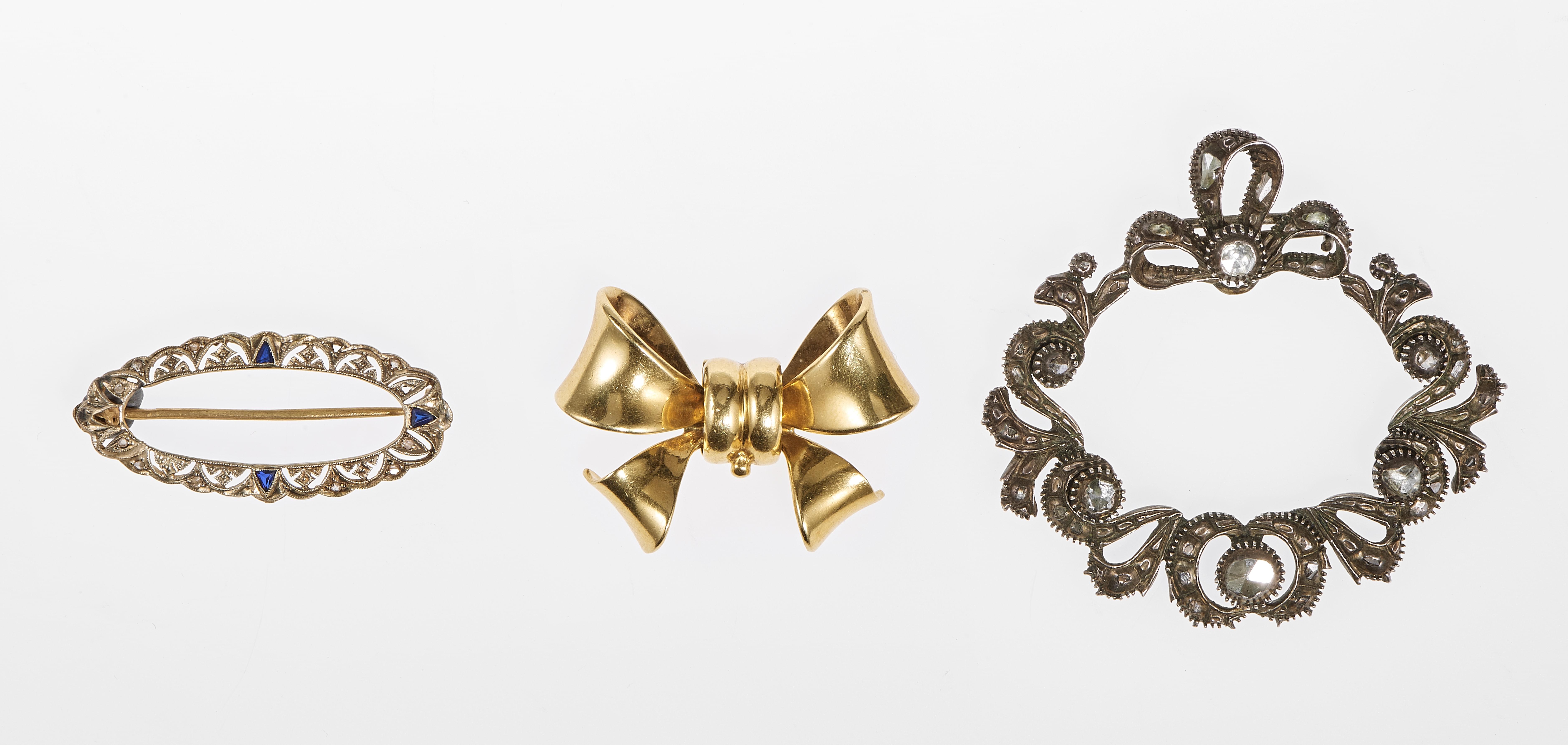 3261. Lot d'un fermoir de collier à motif de nœud et d'une broche ovale sertie de petits saphirs