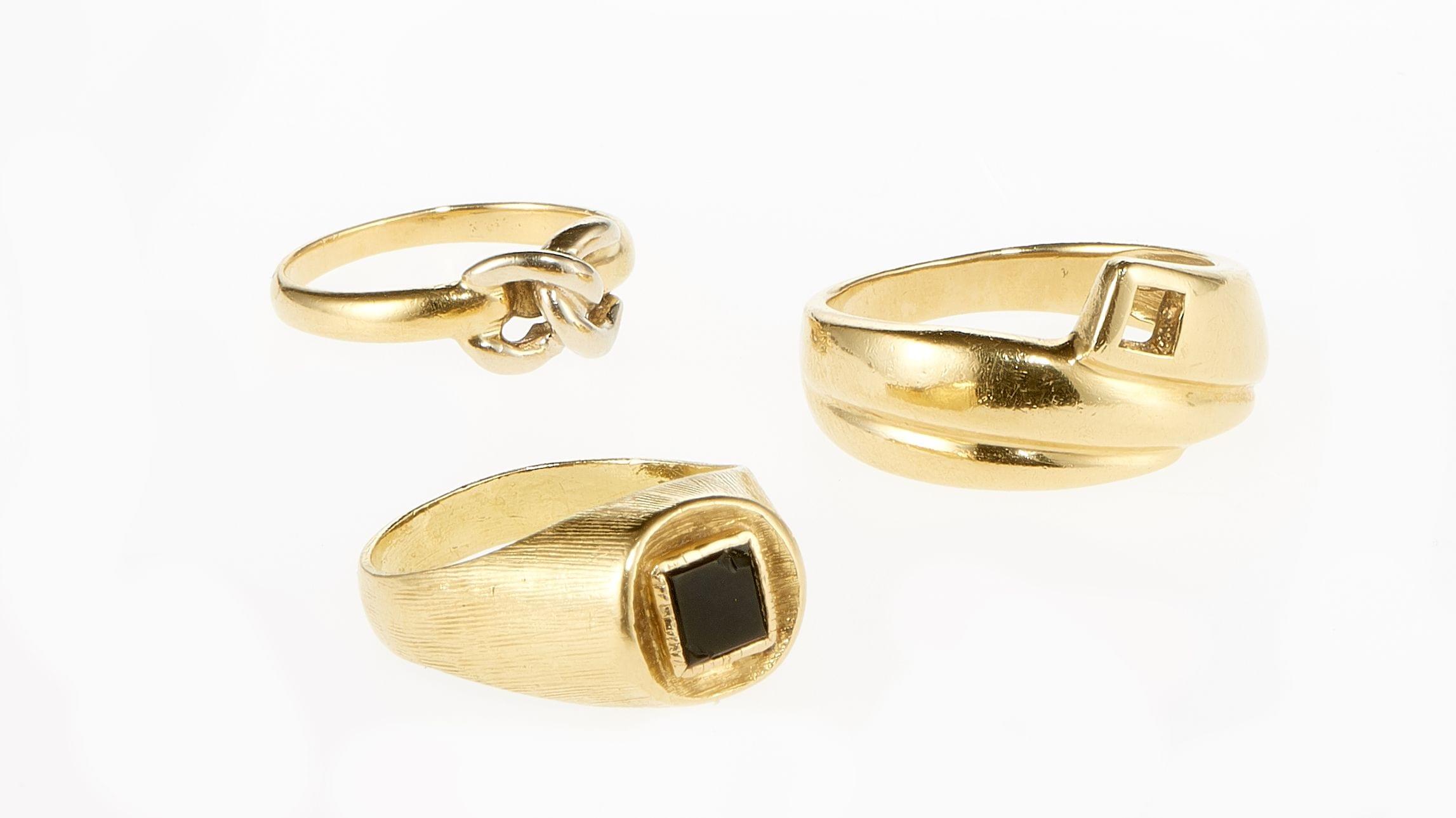 Or 750, doigt 52-12 et 56-16, 9 g. On joint une bague de petit doigt à motif d'entrelacs, or 750, doigt 47-7.