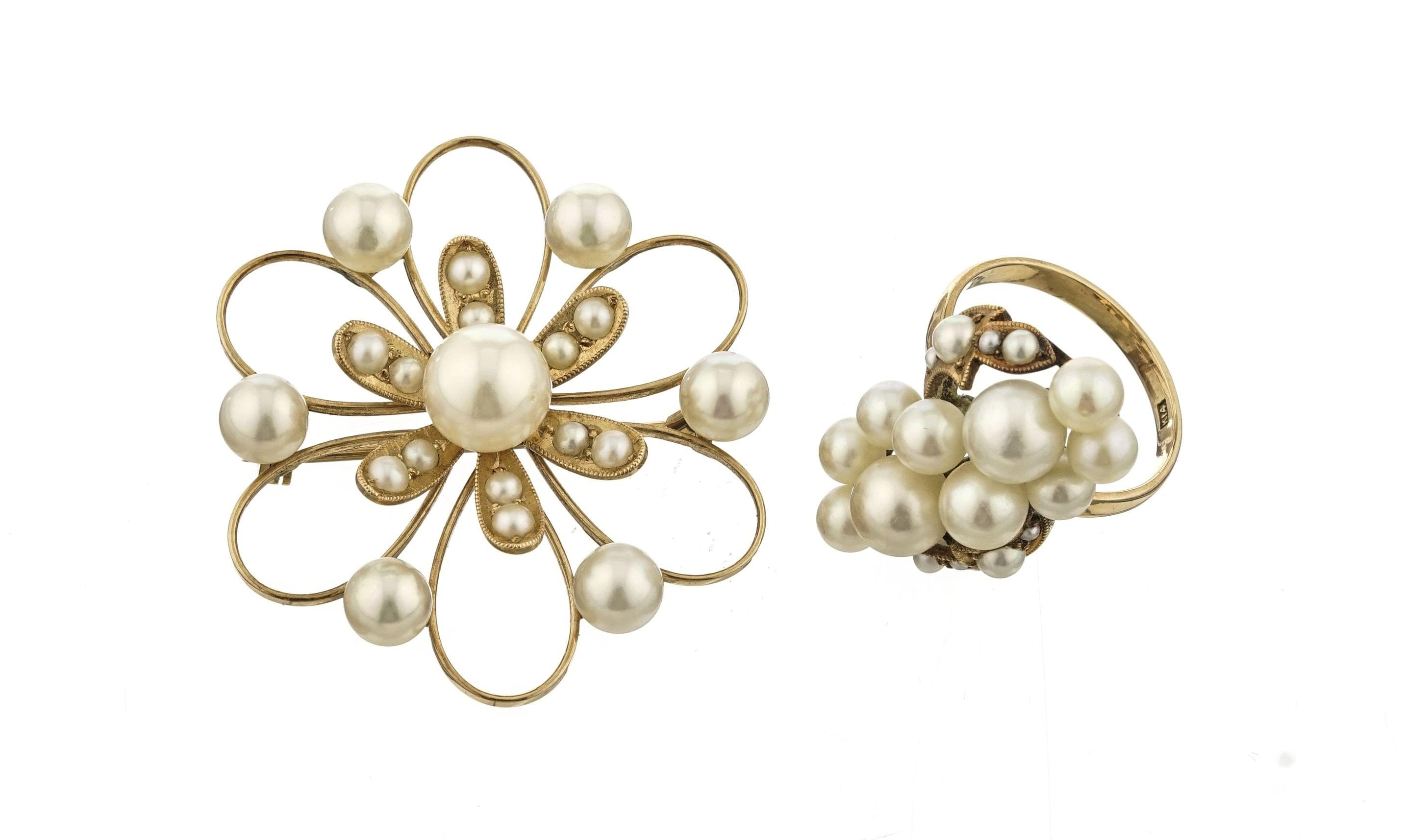 3126. Lot d'une bague et d'une broche à motif de fleur serties de perles