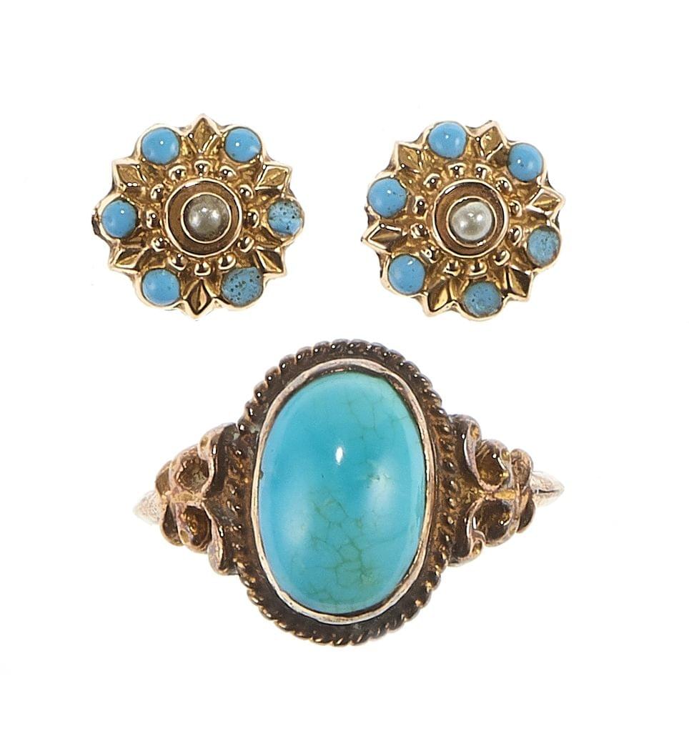 4175. Lot d'une bague sertie d'une turquoise taille cabochon et de clous d'oreilles sertis d'une demi-perle entourée de turquoises