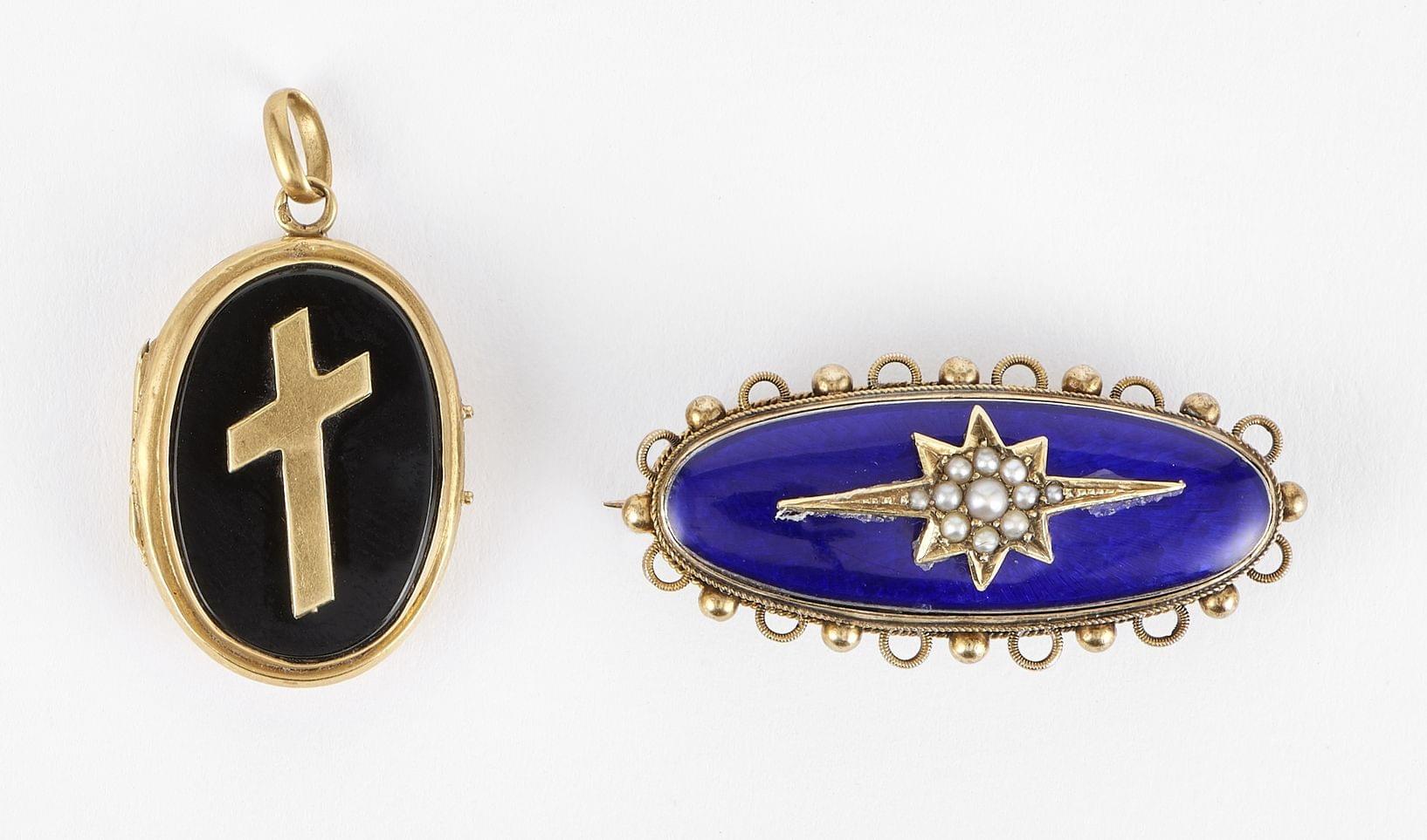 3253. Lot d'une broche et d'un pendentif porte-photo, la première émaillée sertie de demi-perles, le deuxième à motif de croix sertie dans une plaque d'onyx