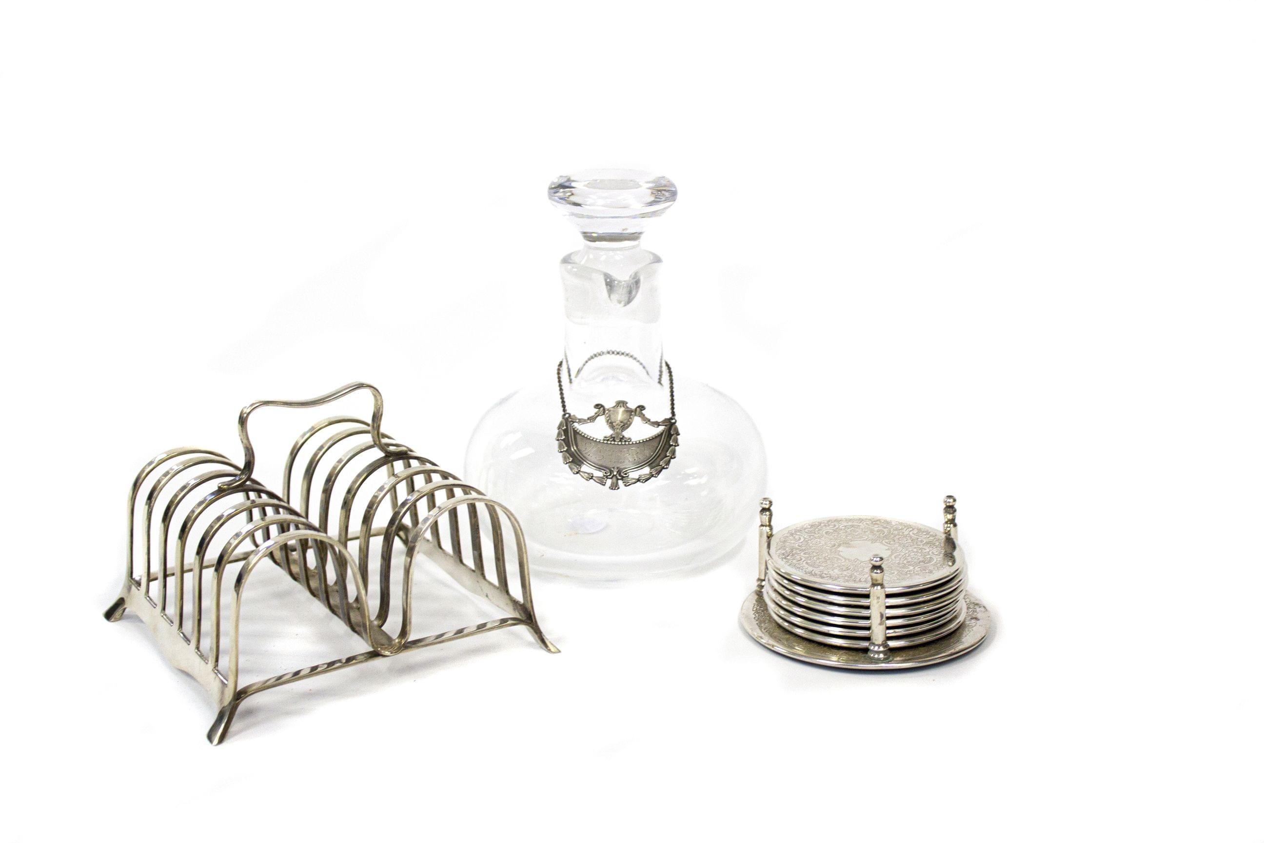 3494. Lot d'une carafe, 6 sous-verres et un porte-toasts