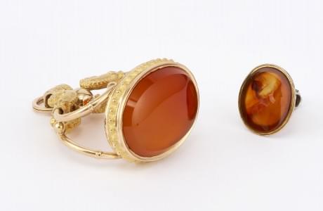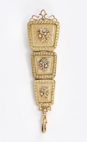 3357. Lot d'une châtelaine, d'une clé de montre de poche ouvragée et de deux cachets