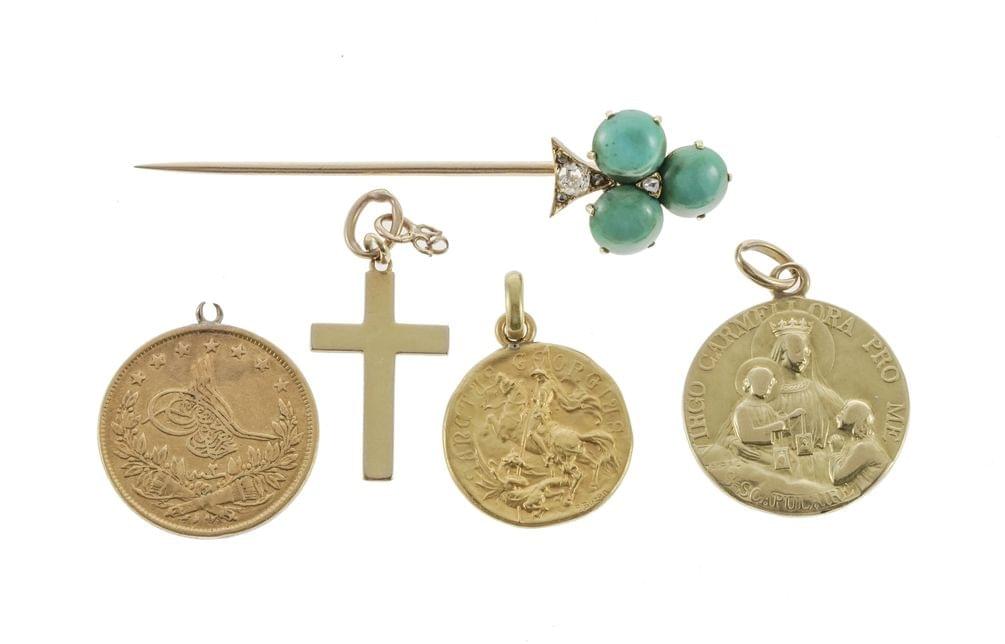3135. Lot d'une croix et de trois médailles, l'une à décor de Saint-Georges, l'une à décor du Christ Sacré-Cœur et l'une retenant une pièce de 100 piastres ottomans