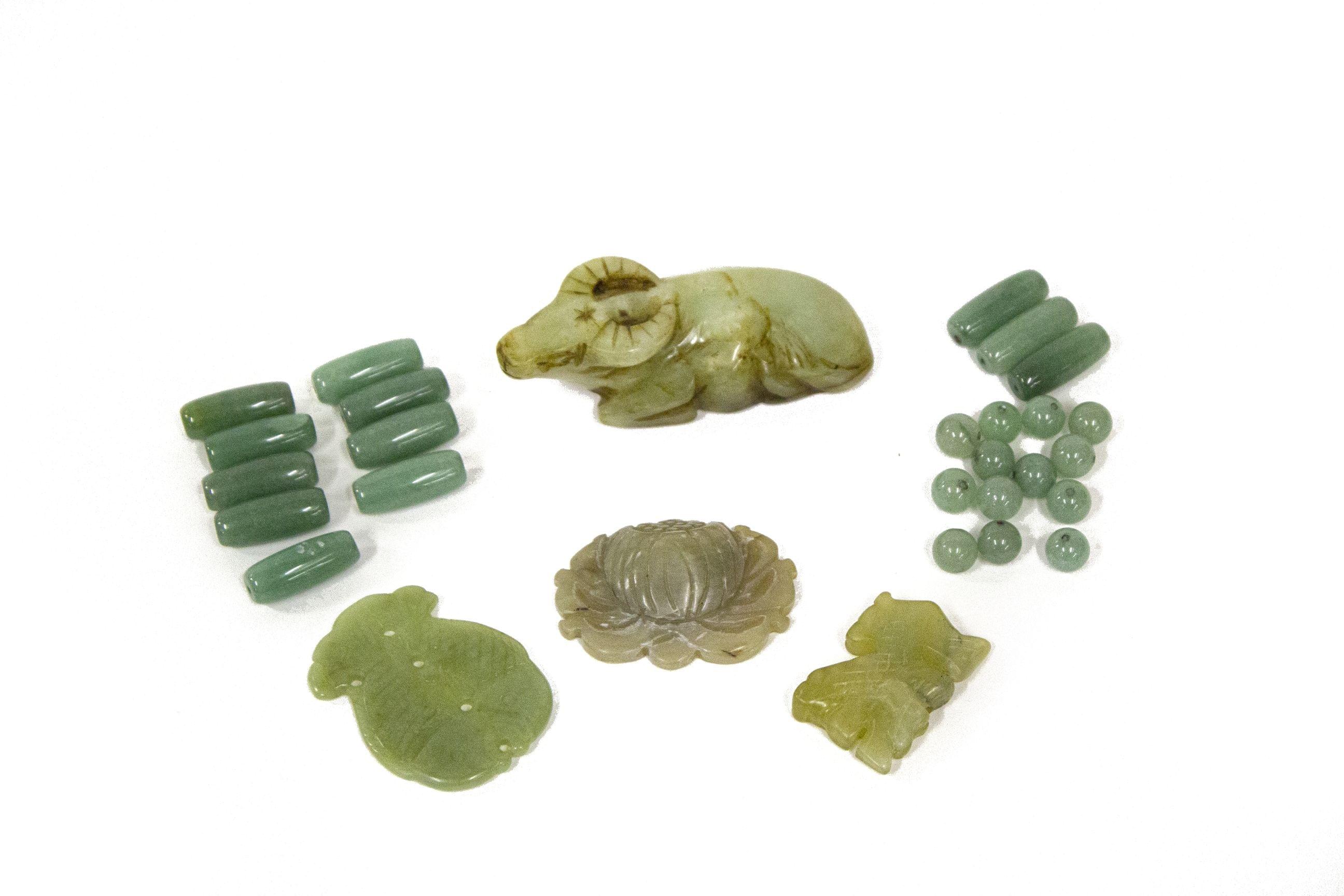 3674. Lot d'une statuette et trois amulettes et plusieurs perles de collier, Chine