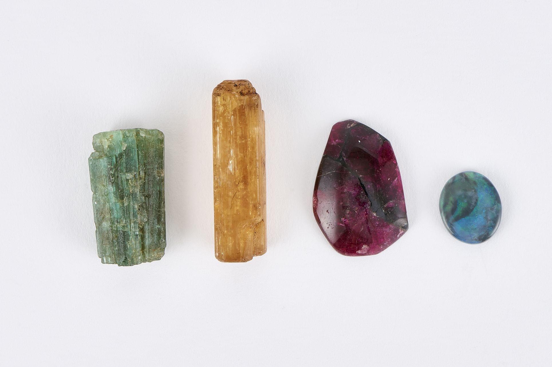 Lots de pierres sur papier comprenant une opale à fond noir ovale (1,9 ct), un brut de topaze impériale (28.7 ct), un brut de tourmaline bleue (15,9 ct) et une rodhonite taille fantaisie (10,9 ct)