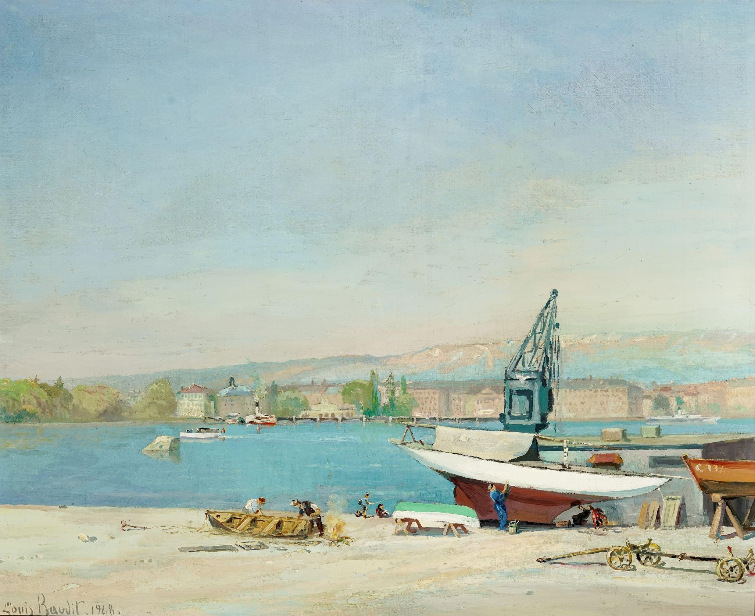 Port des Eaux Vives, huile sur toile, signée et datée 1948, 60x73 cm
