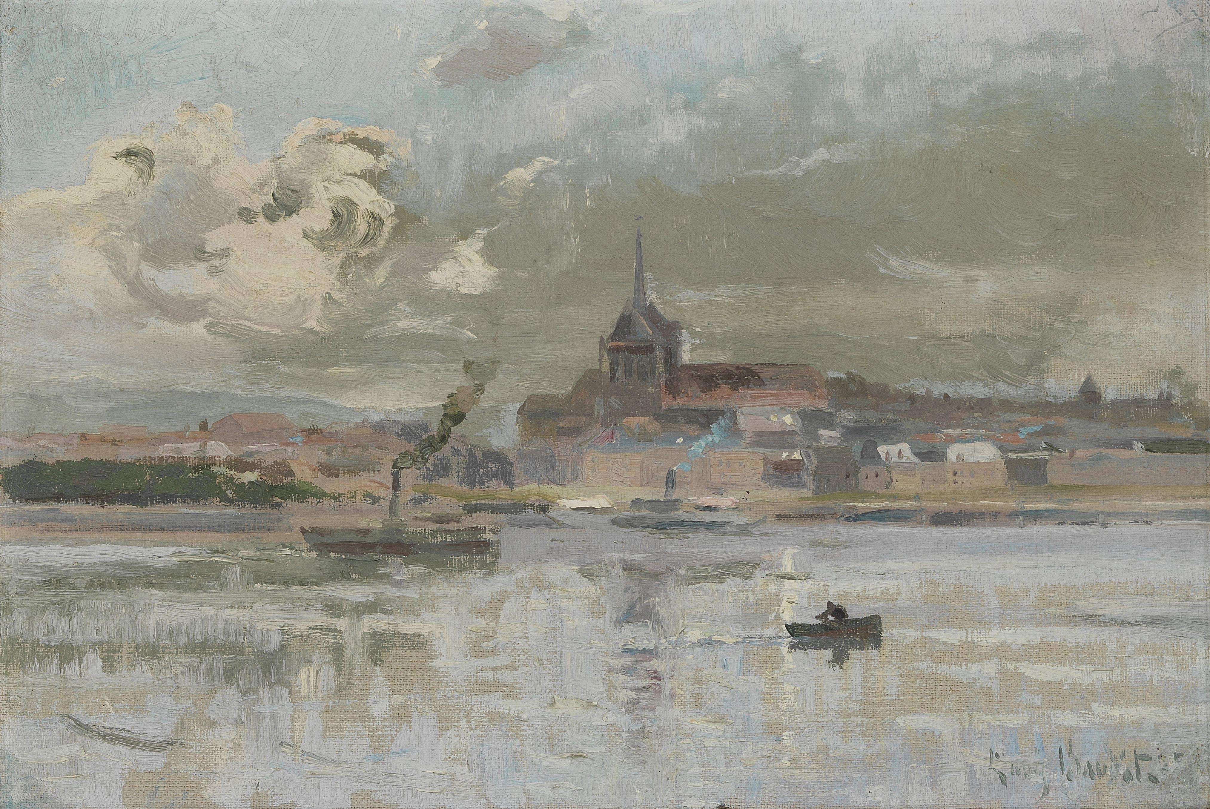 Cœur du jour dans le port de Genève, huile sur toile, signée, datée au dos 1925, 24x34 cm