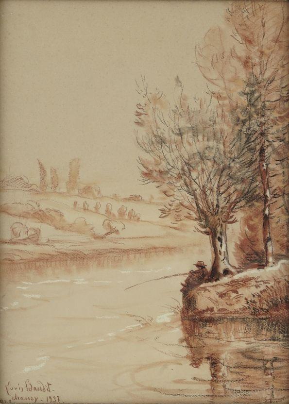 Le confluent du Rhône et de la Laire à Chancy, sanguine, fusain et craie sur papier, signé et daté 1937, 37x27 cm