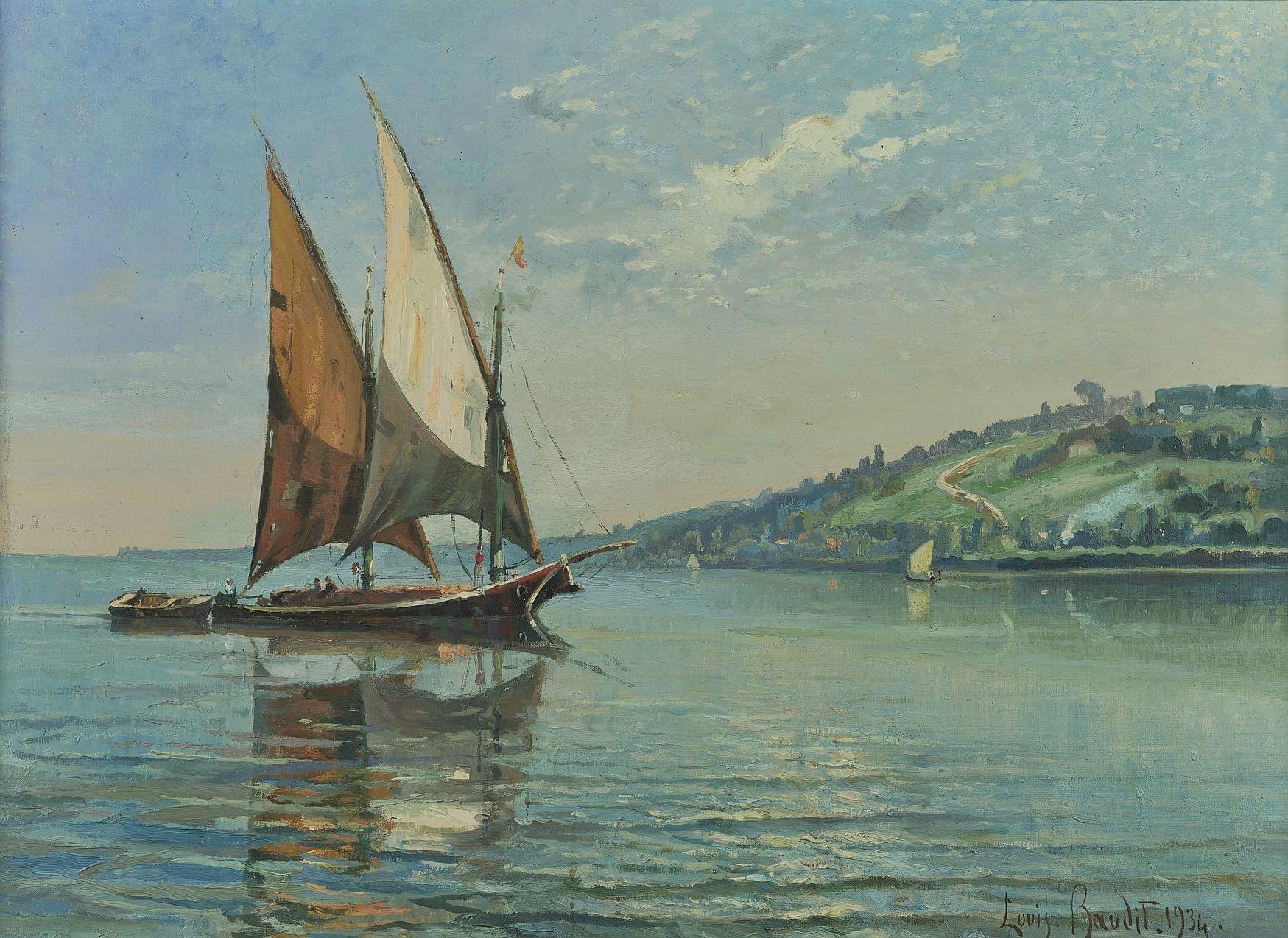 Barque devant le côteau de Cologny, huile sur toile, signée et datée 1934, 52x72 cm