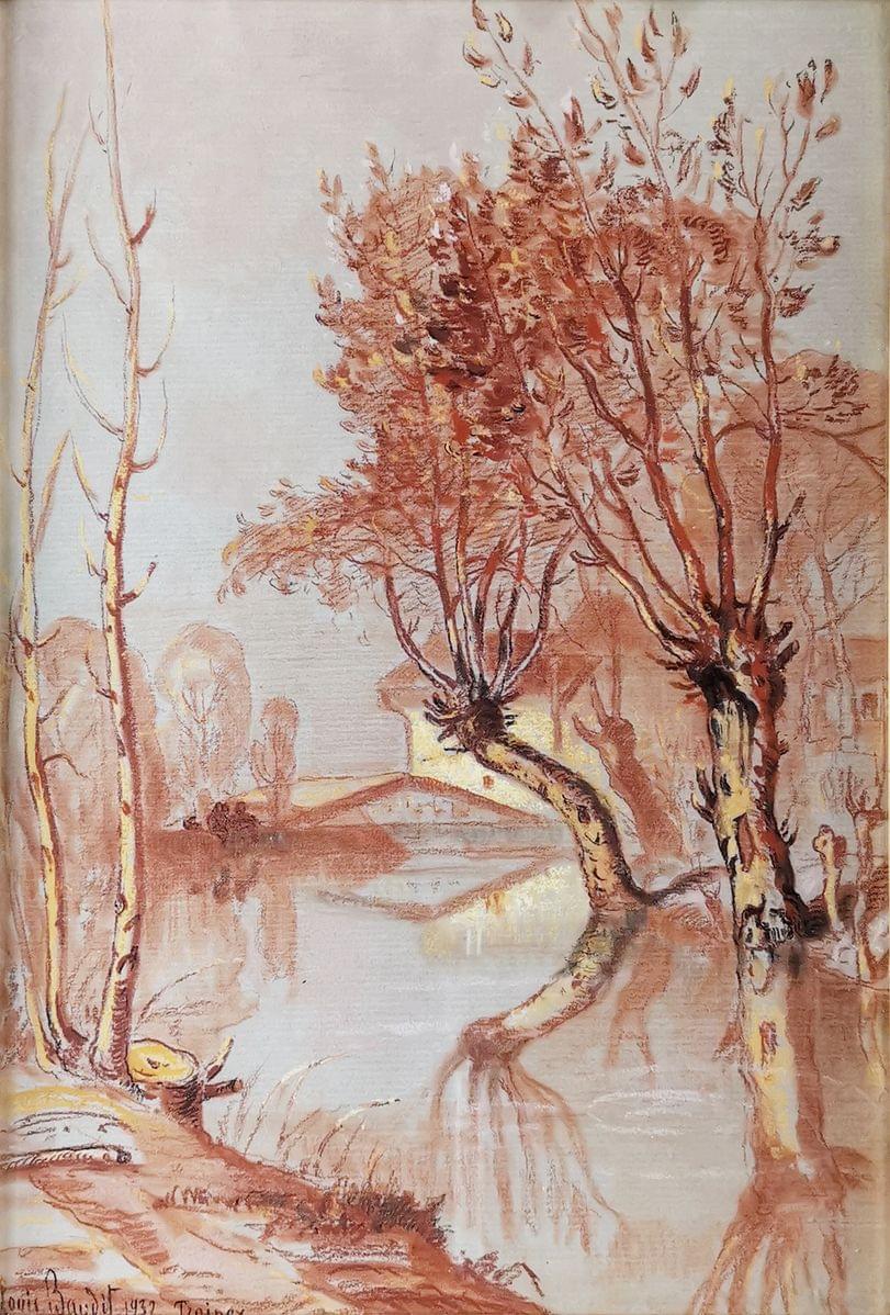 Arbre sur une rivière, fusain et gouache sur papier, signé et daté 1933, 47x33 cm