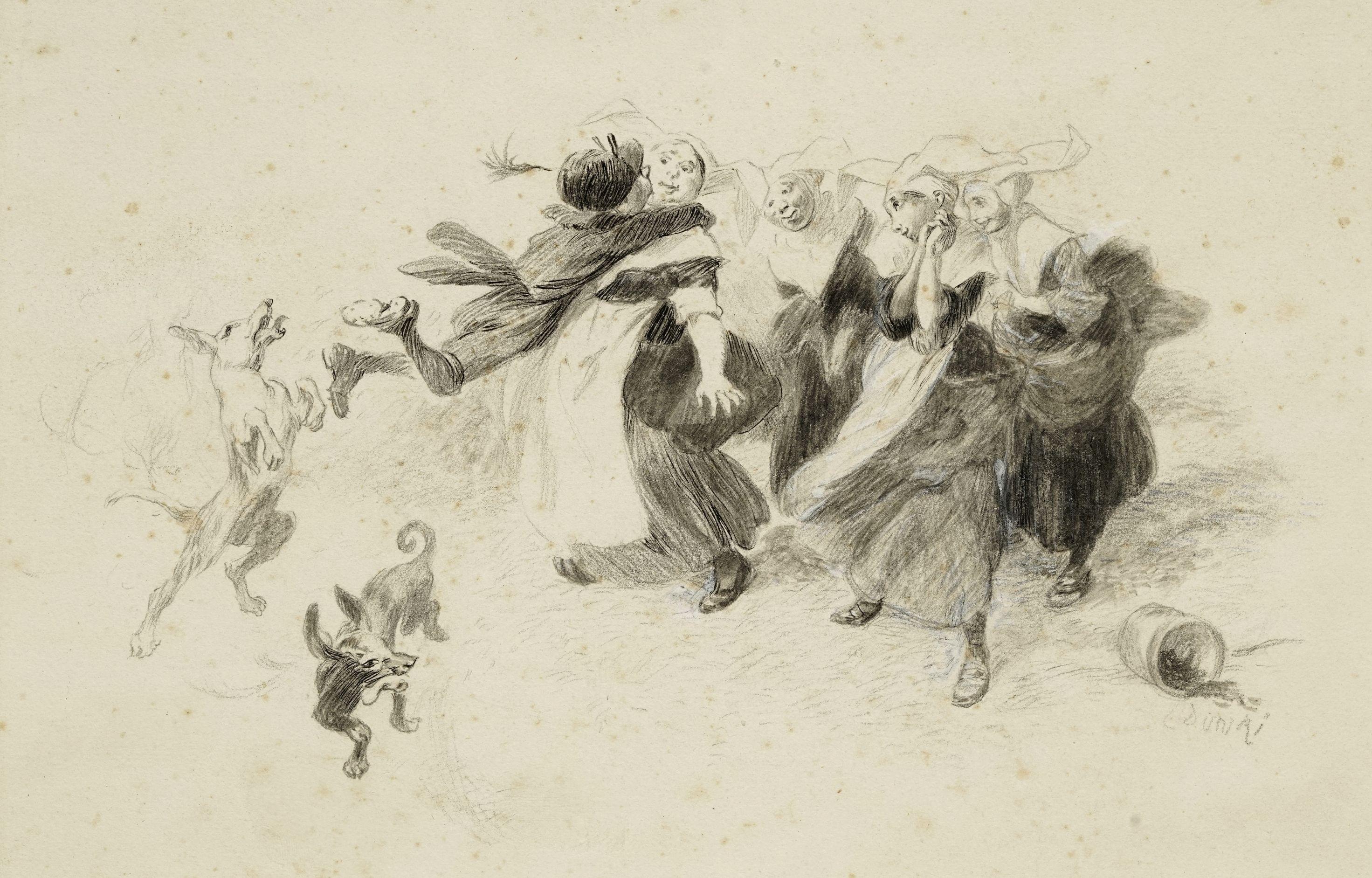 Scène avec religieuses et enfant, crayon et craie sur papier, 18x28 cm