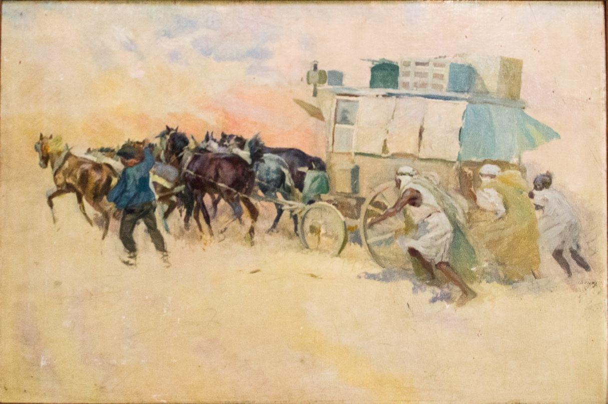 Diligence dans les sables, huile sur carton, signé, 46x70 cm