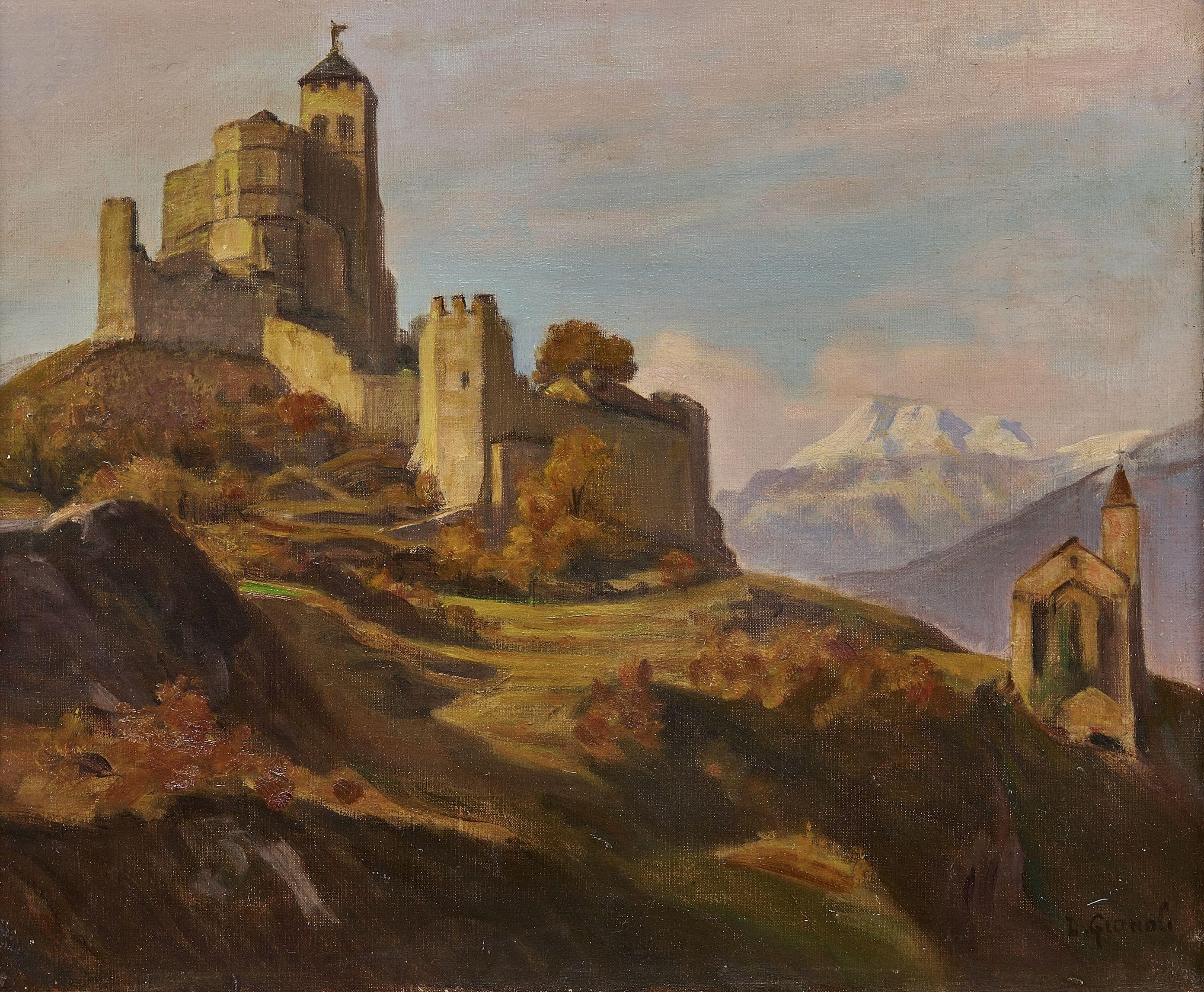 Vue de la Basilique de Valère à Sion, huile sur toile, signée, 38x48 cm