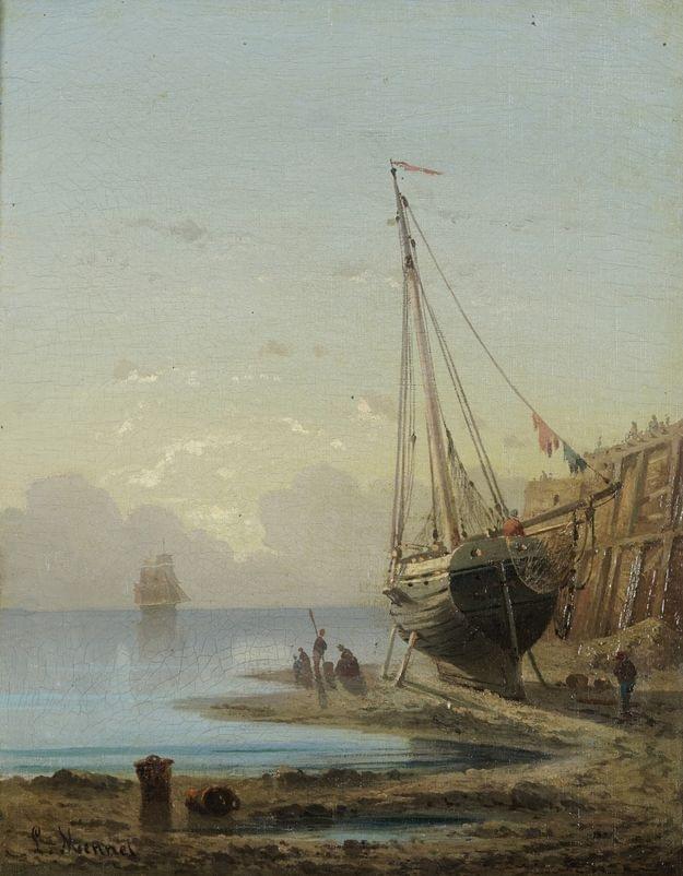 Bateaux échoués, huile sur toile, signée, 26x20 cm