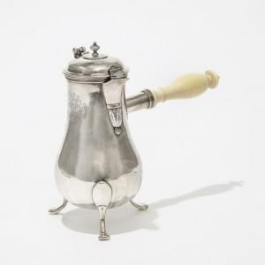 372. Chocolatière piriforme tripode gravée d'armoiries d'alliance d'é...