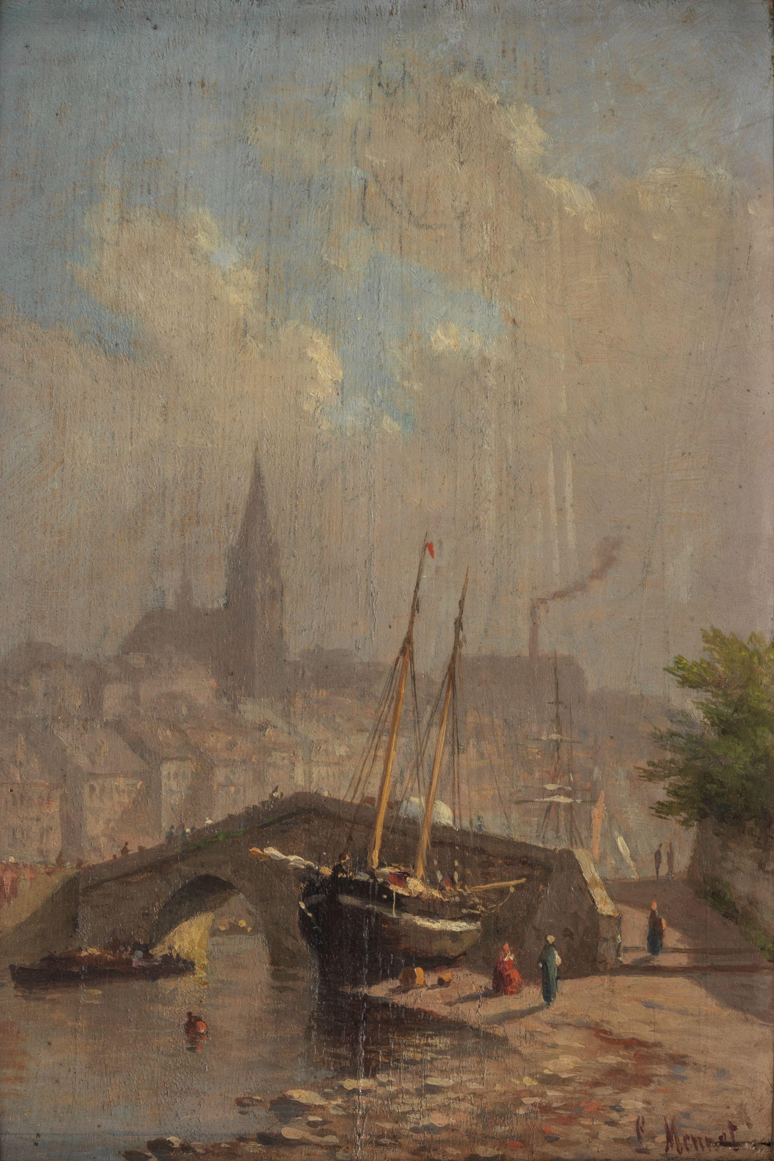 Ville flamande animée, huile sur panneau, signée, 63,5x25 cm