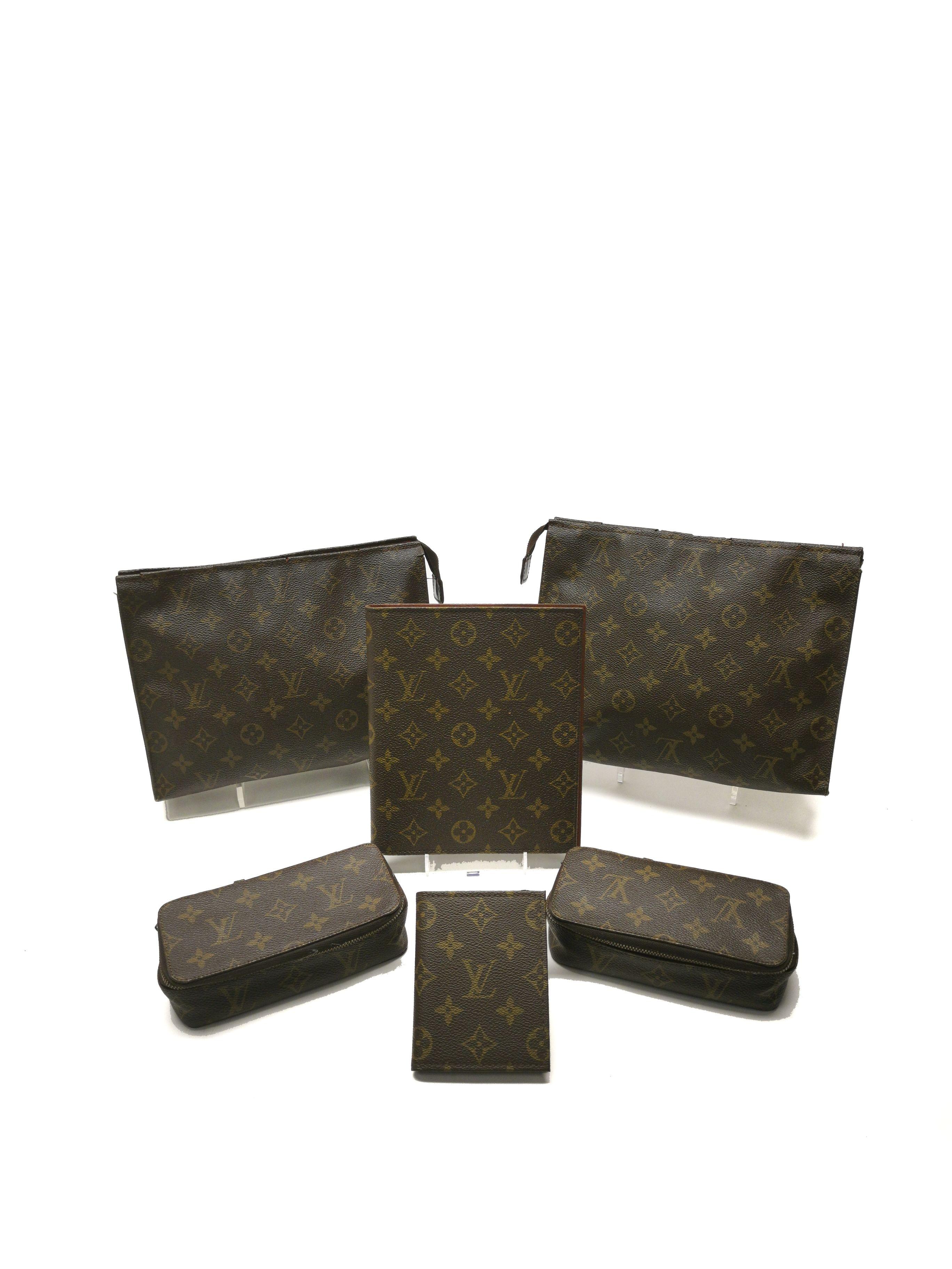 3102. Louis Vuitton, lot deux boîtes à lunettes, un étui à cahier, un porte bloc-notes et deux trousses