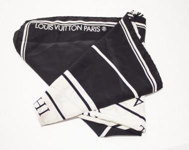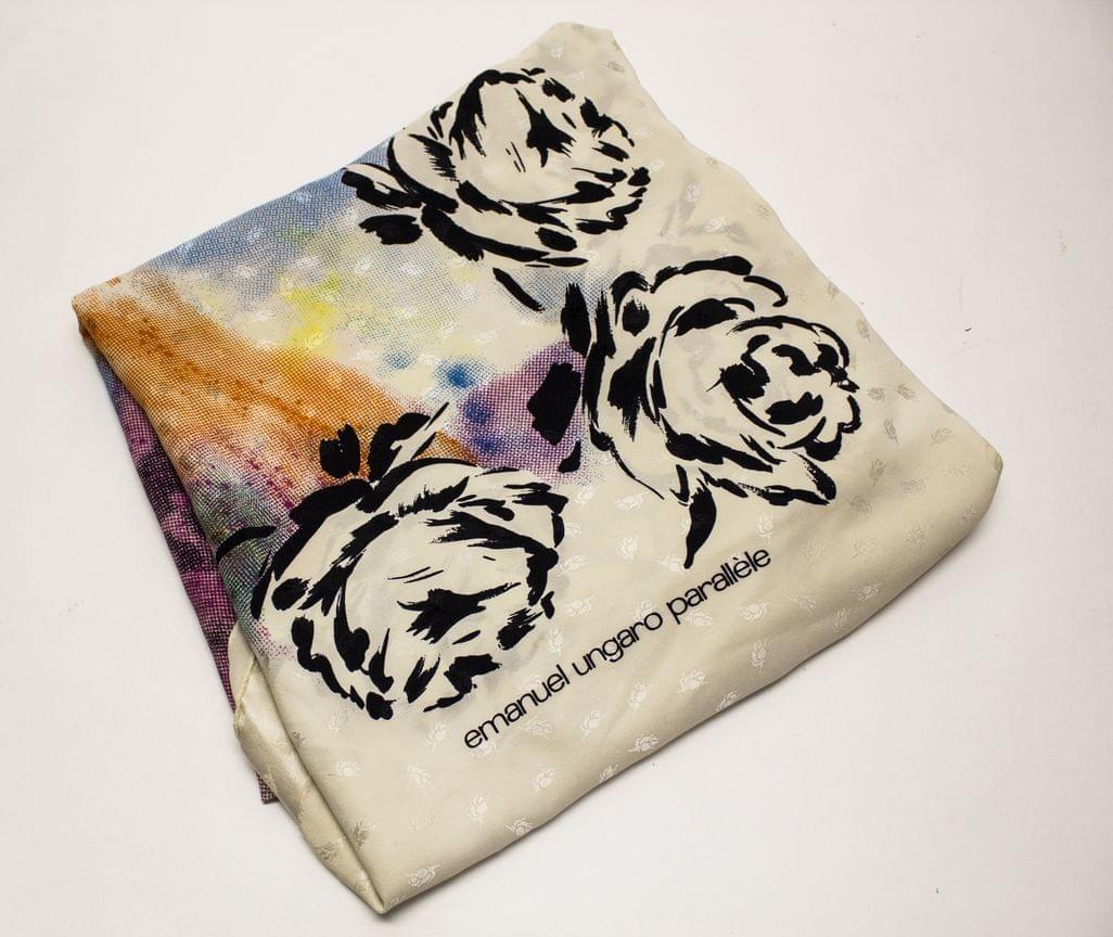 Foulard à décor de montre, soie, 130x130 cm. On joint un foulard Emmanuel Ungaro en soie à couleurs pastel, 130x130 cm
